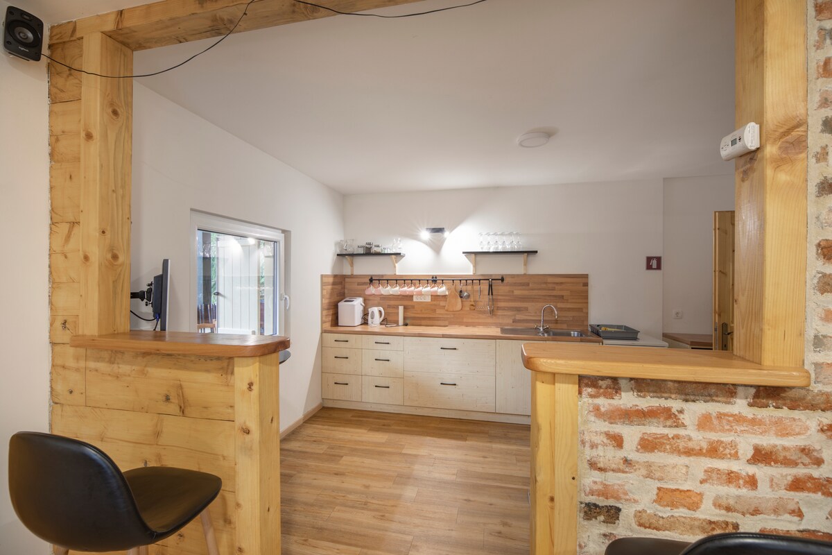 Relájate en este tranquilo y elegante apartamento a solo 1,5 km de los balnearios de Dolenjske. En el abrazo de la naturaleza con vistas al río, puedes disfrutar de la escapada perfecta. El apartamento tiene 2 dormitorios, un amplio baño , una habitación adicional y un hermoso espacio central con cocina, una mesa de comedor y una gran zona de estar y una chimenea. Apaga la chimenea, apaga las luces y relájate después de visitar saunas, piscinas en Dolenjske Toplice o esquiar en Gače.
