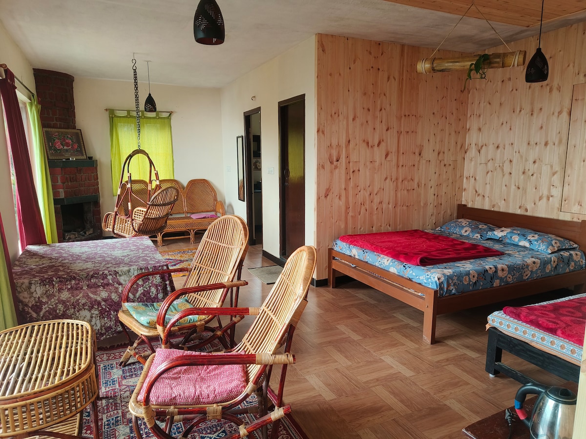 A pocos pasos de una cascada privada rodeada de vegetación en un huerto de peras de 4 acres. La cabaña Magnolia es ideal para un máximo de 5 personas; 2 en el dormitorio privado de la planta baja y 3 en el piso del desván. Todas las casas de campo y el comedor común tienen wifi, agua caliente las 24 horas, los 7 días de la semana y electricidad. Somos accesibles en auto y hay estacionamiento en la granja. En la granja se ofrecen comidas vegetarianas y no vegetarianas al estilo casero: Desayuno: 250 rupias por persona Almuerzo: 300 rupias por persona Cena: 400 rupias por persona.