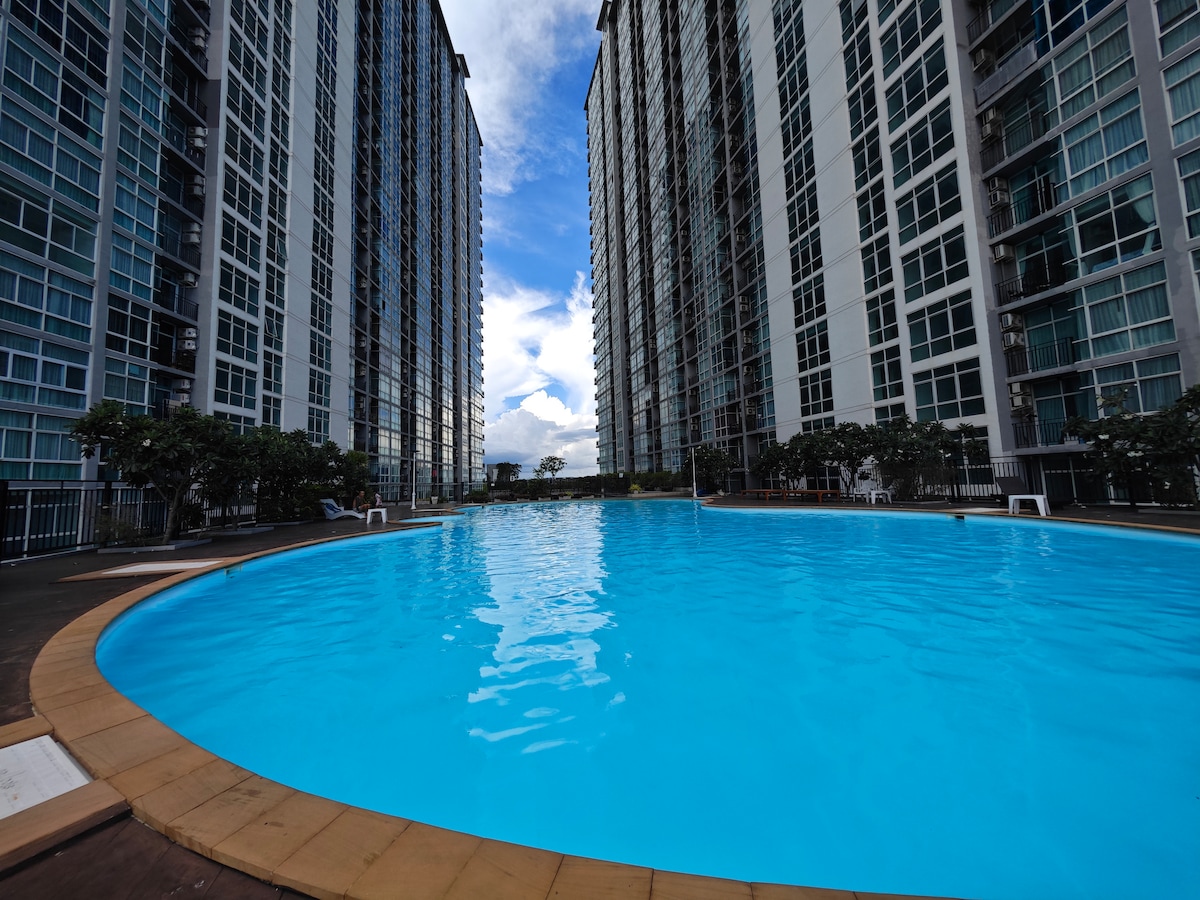 HABITACIÓN - En la planta 34, 36 m², 1 dormitorio, 1 baño, 1 comedor/salón. - 1 cama tamaño king (6 pies) 1 sofá cama (1,5 m) - cocina integrada con campana extractora y cocina eléctrica - 2 aires acondicionados, nevera, microondas, hervidor de agua INSTALACIONES - Frente a la playa privada directa, piscina - piscina con tobogán, gimnasio - restaurante en la azotea con vistas al mar Ubicación muy conveniente, comida local, tienda de conveniencia (7-11), servicio de lavandería. Taxi, cambio de dinero, masaje justo enfrente