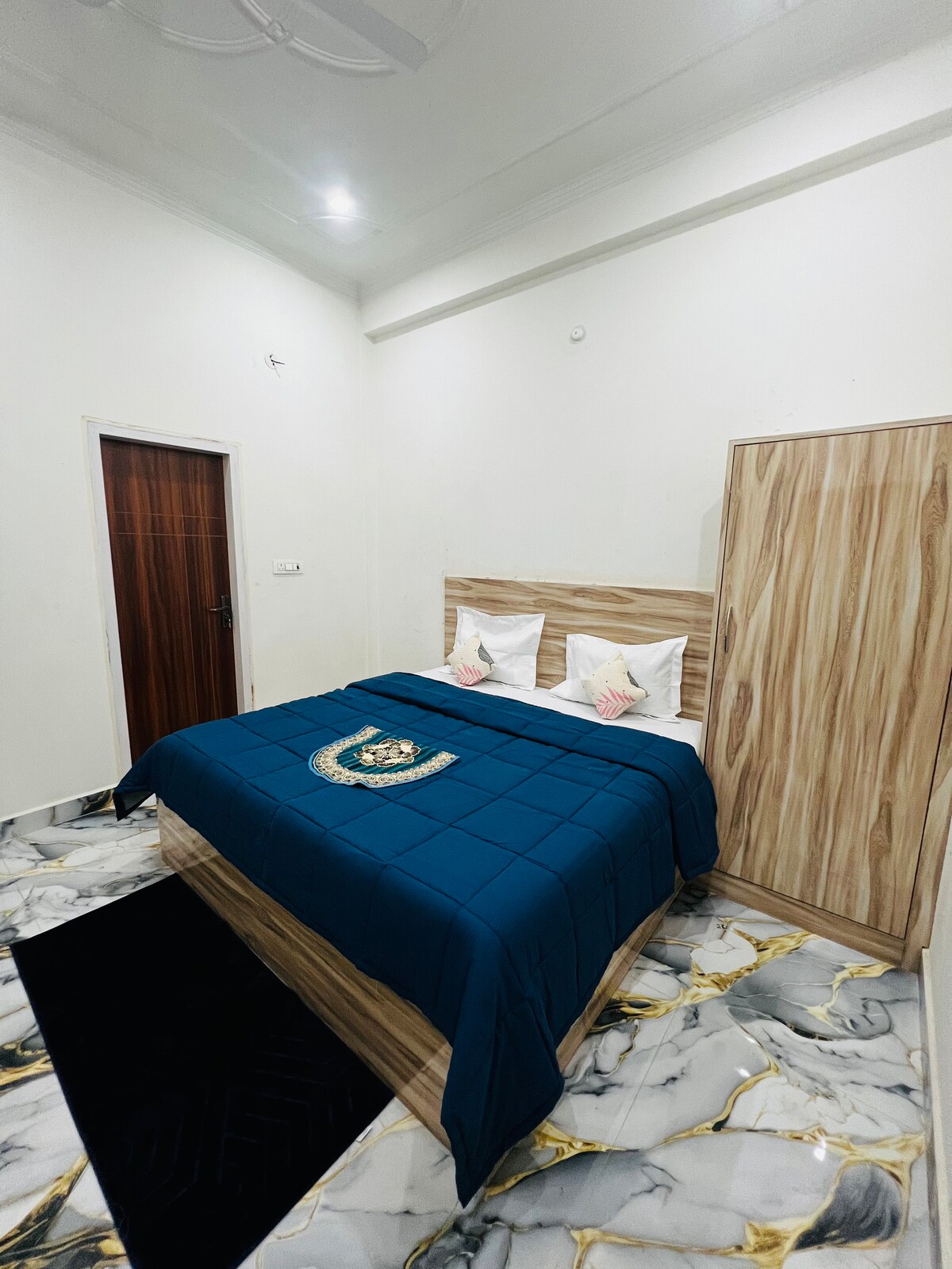 Welcome to Kridha Homestay, a serene and comfortable retreat located in the lush surroundings of Vrindavan. Enjoy our well-appointed accommodations and convenient amenities during your stay. A spacious, comfortable, traditional 3BHK ground-floor property featuring two air-conditioned bedrooms with king-size beds and one non–air-conditioned bedroom with a single bed. Extra mattresses are available for additional guests, making it ideal for families and groups.