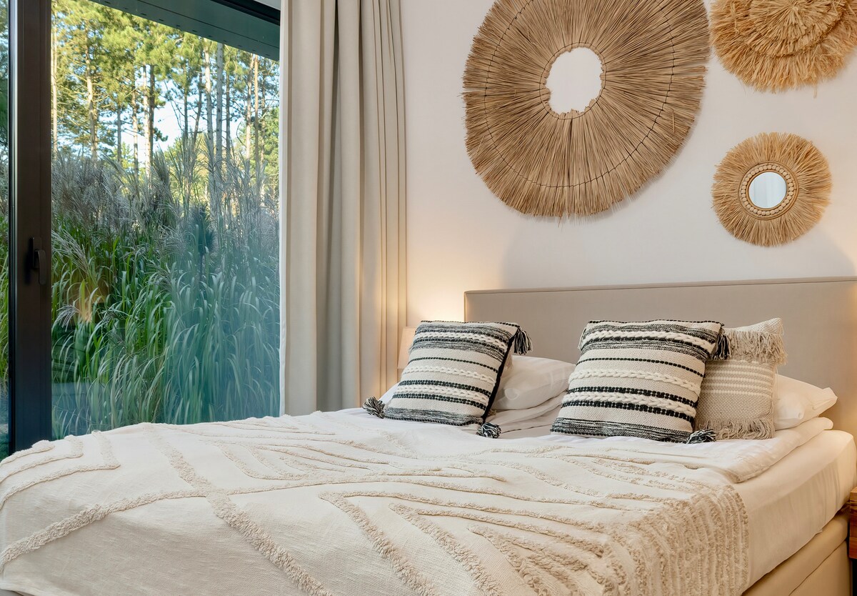 Apartamento con jardín, entre el mar y el lago, en el corazón de una reserva natural y un pinar, a 3 minutos a pie de la playa. Hay una terraza privada, cubierta y espaciosa, sala de estar con cocina americana totalmente equipada, dormitorio, baño, garaje subterráneo y sala de bicicletas. Los grandes ventanales permiten que la naturaleza entre en el interior del apartamento, por lo que siempre estás en contacto con la naturaleza. En las instalaciones de la finca: sauna, piscinas, jacuzzi, gimnasio y zona de spa (con cargo adicional).