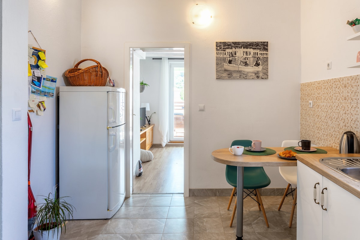 This apartment was freshly renovated in 2025. Spacious and cozy apartment with a lovely sea view balcony. It is placed on the third floor of our family house, “Veli Bok”. The apartment consists of an entrance hall, bathroom, studio area (kitchen, dining area, sleeping area, and living room area), and a balcony. Ideal for a couple or small family with one or two small kids. Our house is located 20/25 minutes' walk from the harbour/main square, which is 1,5 km/2 km away.