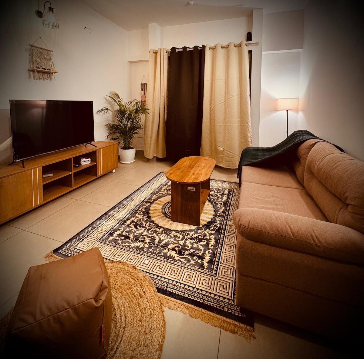Estudio de lujo de estilo boho con jacuzzi y jardín. Una escapada tranquila. Totalmente equipado con wifi, cine en casa JBL 2.1, sistema de música BT y TV LED Full HD. Un elegante baño con artículos de aseo. Despensa con suministros de té/café, agua RO, microondas, placa de inducción, nevera y tostadora s/w. Jardín vallado para niños. Cena en el jardín con buen tiempo. El jacuzzi tiene agua caliente que se puede usar en cualquier momento. Servicios comunes en el lugar como piscina, sala de juegos, gimnasio, miniteatro, ciclismo y restaurante.