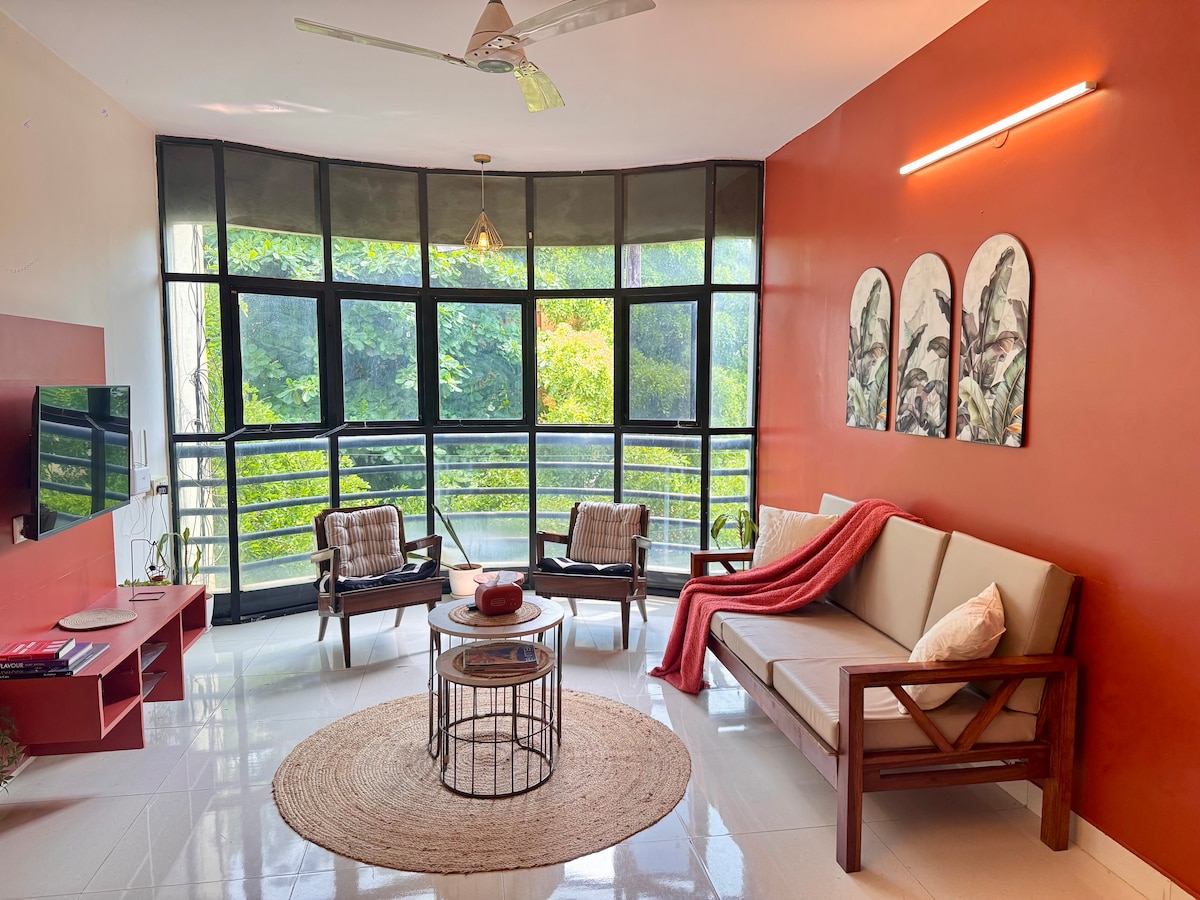 Tranquilo 1 BHK · Amplia sala de estar y silla colgante