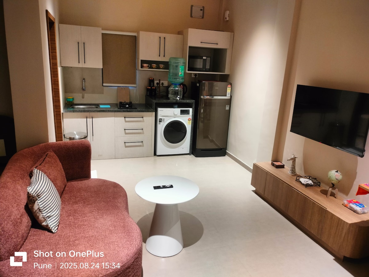 Ofrecemos un 10% de reembolso . No se permite compartir el lugar, todo el privado. Este departamento es uno de los mejores departamentos de servicio en el centro de Pune. Wi-Fi gratis TV de alta definición Tatasky de 43 pulgadas. RO Water Cocina modular utensilios de cocina Mixer Grinder Gas y tienda de GLP Refrigerador Microvan Tienda de comestibles gratuita Plancha Jabón líquido y lavado a mano Toallas Cama King Guardarropa Sofá Ventiladores CCTV Estacionamiento cubierto. Personal DE limpieza No se permite comer.