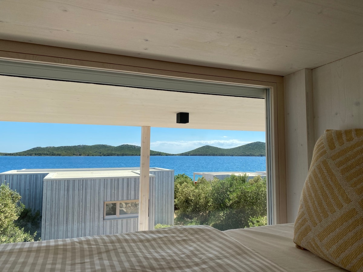 IMPORTANTE: selecciona tu período: los asistentes al festival (thegardencroatia .com/eventos) o familias. 1 noche GRATIS para estancias demás de 14 días Moderno (2023) y elegante bungalow, con todos los servicios y estacionamiento. Vista directa al mar desde la amplia terraza escondida entre olivos y robles. Playa aislada, en una bahía al borde de las islas Kornati. Zona tranquila y silenciosa, perfecta para grupos que quieren relajarse y despejar. Atracciones cercanas en auto. Perfecto para grupos de 4, con 2 dormitorios y baños.