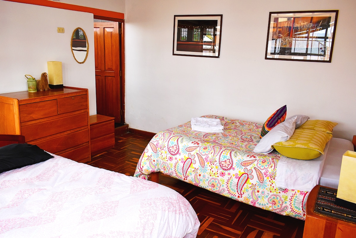 La habitación cuenta con hermosa vista de la ciudad del Cusco, con una cama de 2 plazas y un baño con ducha en el pasillo, con agua caliente. Además cuenta con minirefrigerador y horno microondas en la sala compartida. EL PRECIO INCLUYE DESAYUNOS, los cuales se sirven sólo en el horario de 7 a 8 am. El desayuno incluye: 01 taza de café o mate, 01 vaso de jugo y 2 panes con acompañamiento. TAMBIEN PUEDE RESERVAR ALMUERZOS, CENAS Y BEBIDAS (con costo adicional).