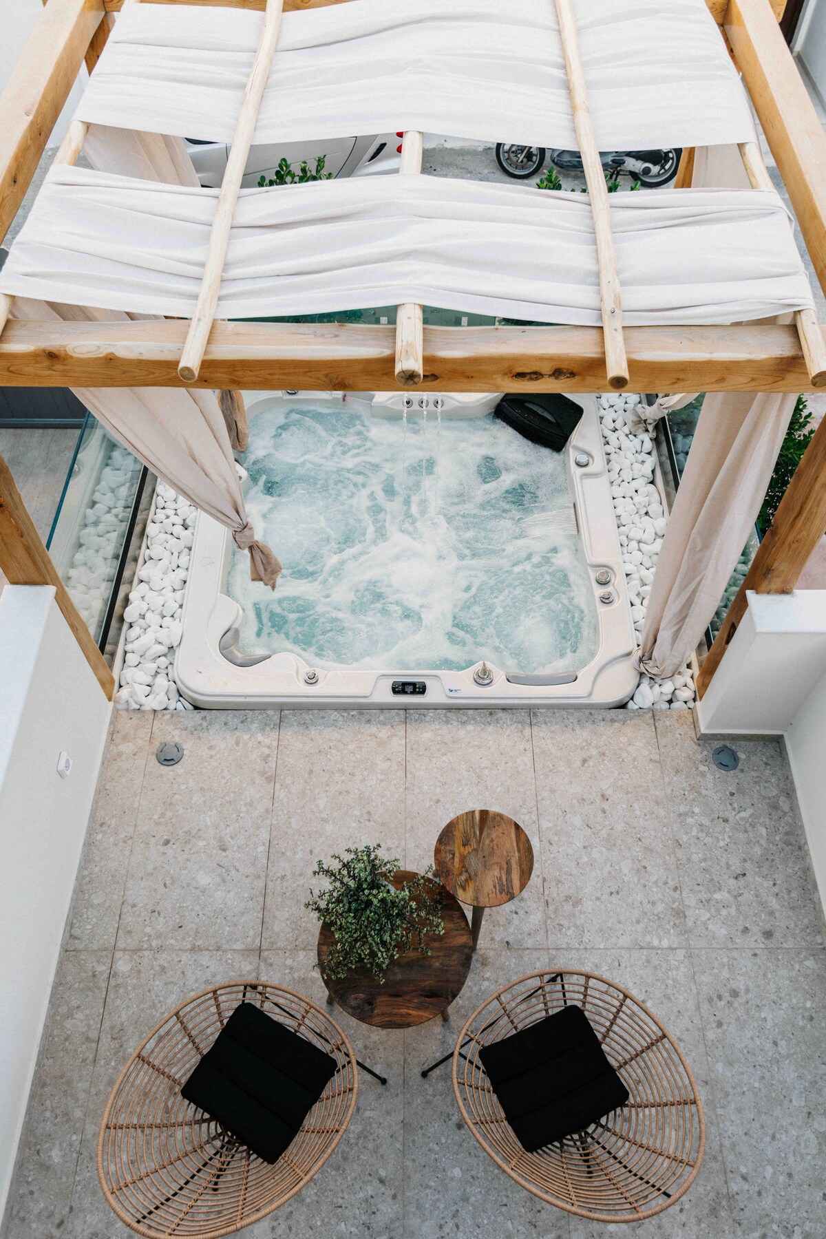 Bienvenido a un nuevo apartamento de cuatro dormitorios, bellamente diseñado y decorado, ubicado en el corazón de Naoussa. El mobiliario y la decoración están diseñados con colores blanco y arena y toques de madera natural, creando un ambiente relajante. Hay dos patios privados, uno con jacuzzi y mesa de comedor. Disfruta de una experiencia elegante.