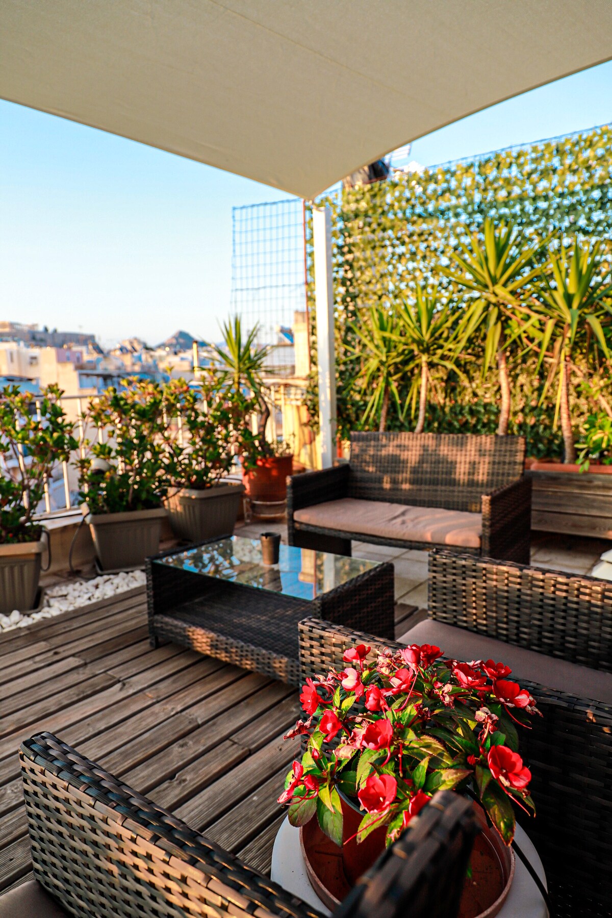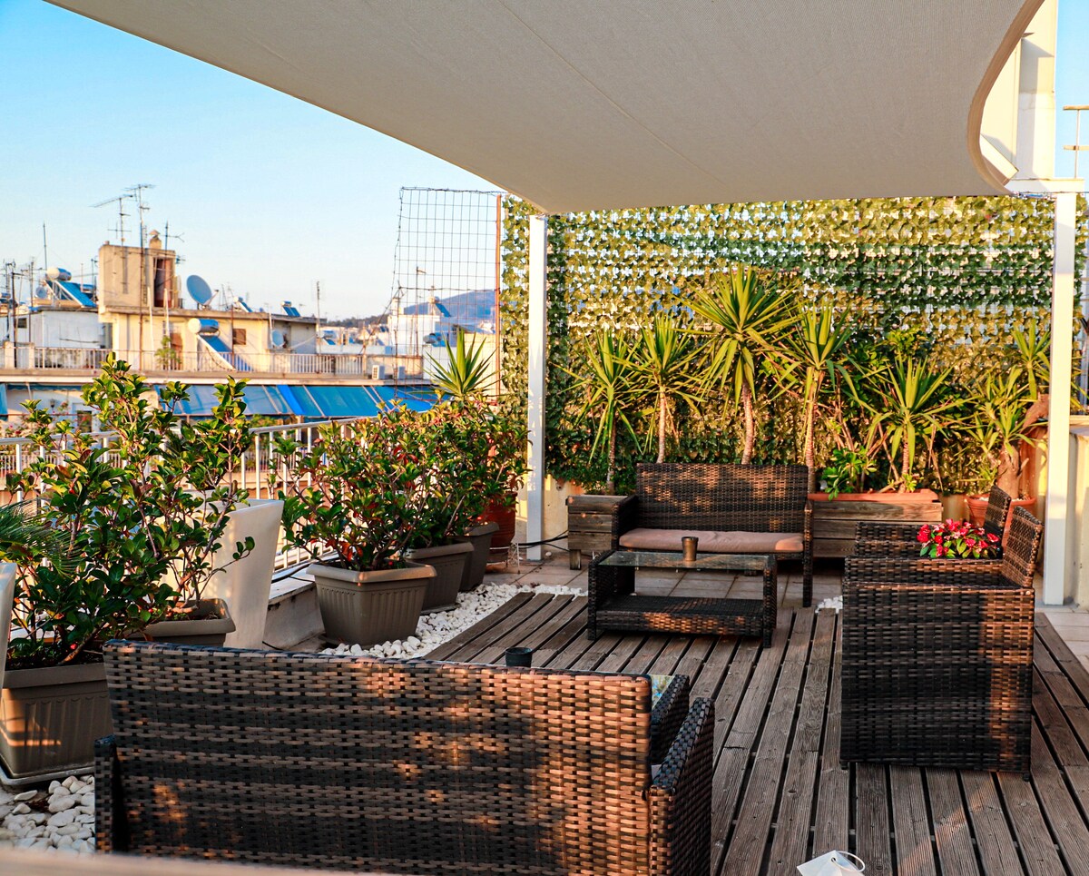 Un lujoso edificio histórico antiguo, con unas vistas impresionantes de Philopappou Hill y al mar, te da la bienvenida a Atenas para ofrecerte una experiencia única. Estarás en un antiguo vecindario gráfico y tranquilo. Puedes relajarte mientras estás sentado en la terraza con vistas a la colina y al mar y al mismo tiempo en un paseo de 10 minutos puedes estar en el Partenón y en los otros sitios arqueológicos principales. El apartamento se limpia y esteriliza de acuerdo con las pautas del Ministerio de Salud.