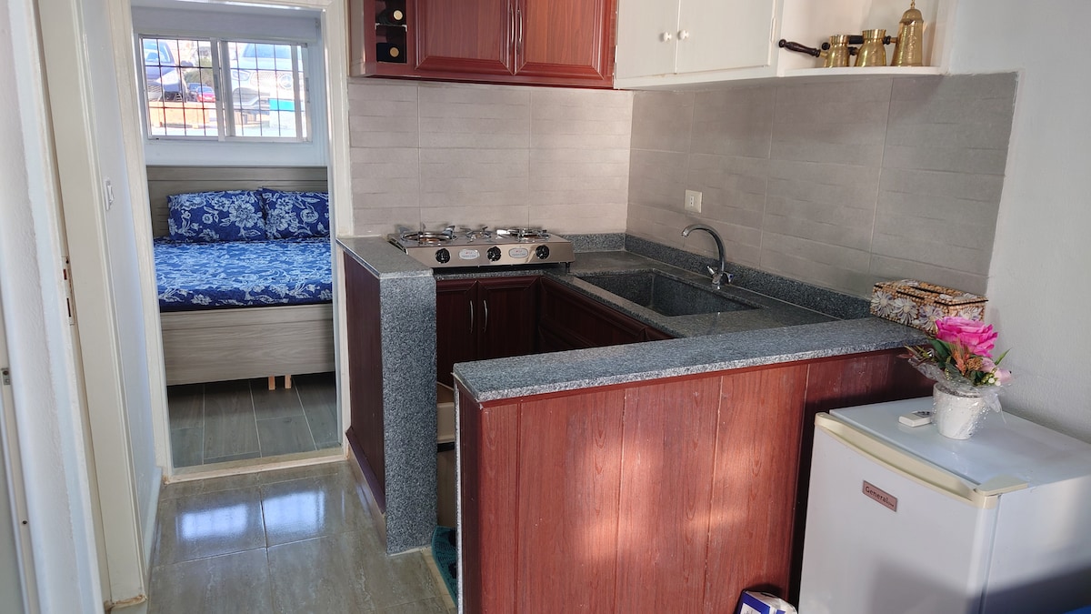 Cocina totalmente equipada, una cama tamaño queen y 3 camas individuales plegables, aire acondicionado central, microondas, nevera grande nueva, TV de 32", dispensador de agua, cortinas, bar, balcón grande, armario grande dividido, aparcamiento asignado.