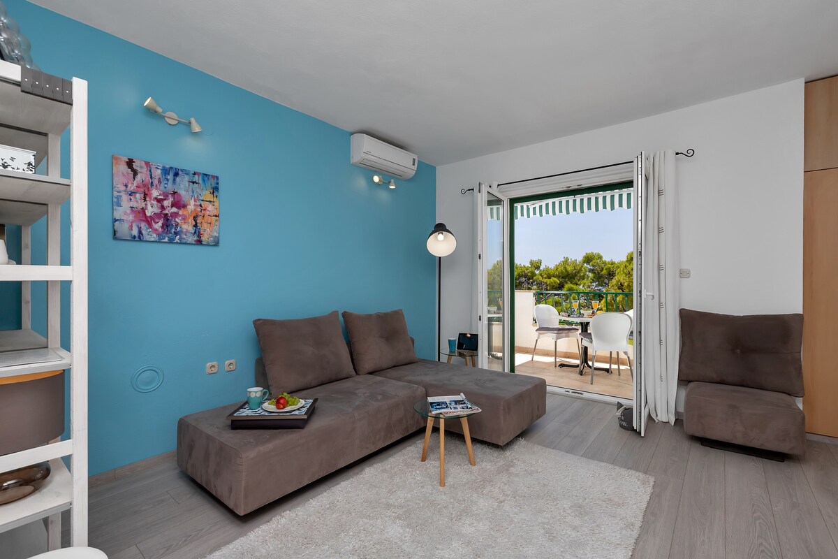 Es el apartamento - estudio de 18 m2 en el tercer piso, que es la habitación con la cama francesa, baño, mini cocina con comedor, televisión por satélite, wifi, elementos esenciales, aire acondicionado, balcón frente al mar, plaza de aparcamiento gratuito La distancia al lugar antiguo es de 150 metros, al mar - lungomare, mercado, plaza principal, restauradores, cafés, discotecas, iglesia, bancos, puerto, mercados 200 - 250 metros, estación de autobuses 250 metros, las playas 450 metros, eskursions a las islas Brač y Hvar posible.