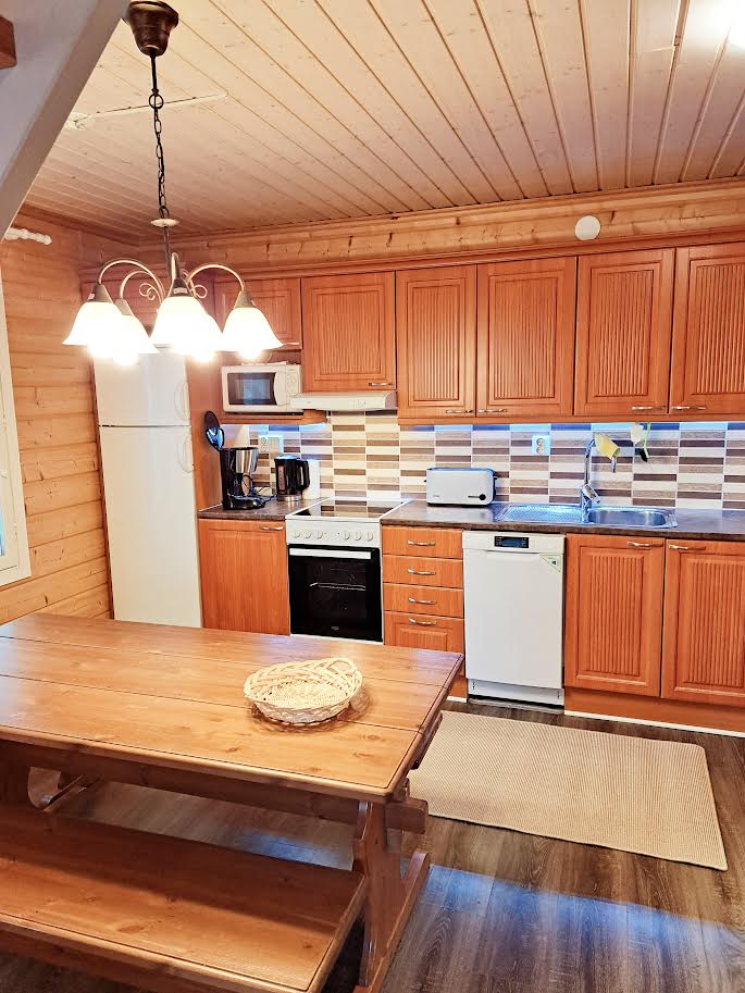 Excelente ubicación junto al mar. Buenas posibilidades para recreaciones al aire libre, refrescante natación en hielo, pesca, etc. Barbacoa de madera de estilo finlandés situado cerca de la casa y una pequeña parrilla privada de carbón en el patio también. Camas para seis personas y sofá cama extra para dos personas. Auto registro de entrada con caja de seguridad. Acampada privada y relajante. Sauna eléctrica, ducha, baño, cocina totalmente equipada con lavavajillas, dos televisores, aire acondicionado, chimenea, dos patios privados. La ropa de cama no está incluida.