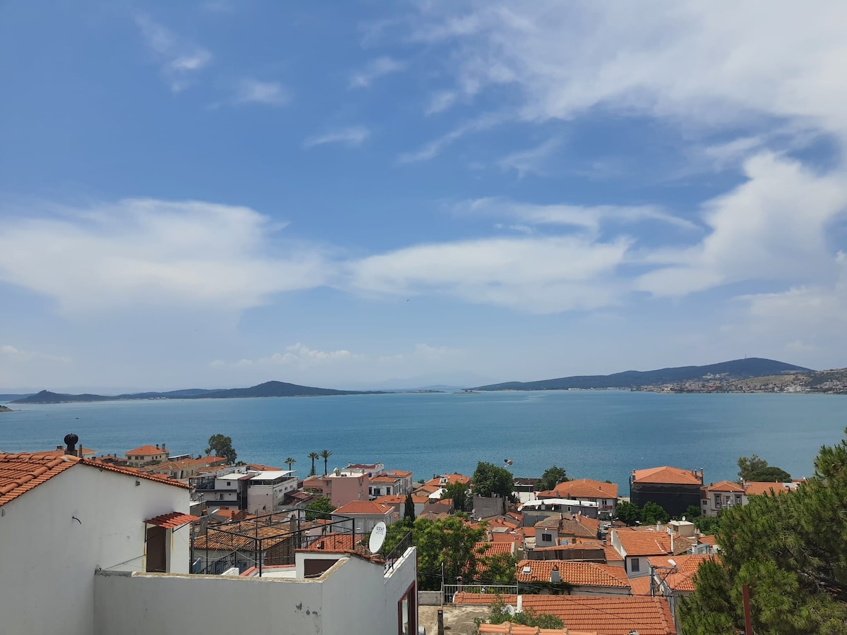 Casa grande de 2 dormitorios en la terraza del segundo piso con vistas al mar y balcón muy grande En la carretera costera de Assos Kucukkuyu, a solo 50 metros de la playa Hay una cama doble francesa en un dormitorio, dos camas individuales en el segundo dormitorio y un sofá cama triple en la sala de estar con aire acondicionado se convierte en una cama doble cuando se saca. Abierto en todas las estaciones. Hay agua caliente, mantas y edredones disponibles para el invierno. El aire acondicionado es suficiente para la calefacción. Se puede proporcionar el calentador del radiador de electricidad.