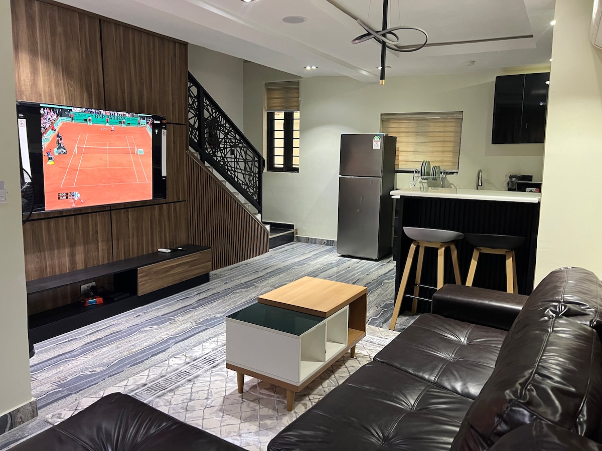 Ven a disfrutar de un poco de privacidad en este apartamento sereno y duplex. La estética moderna y elegante de este espacio es perfecta para escapadas en pareja o para viajeros solitarios. Está totalmente amueblada + ubicada en una finca segura. El espacio cuenta con un servicio de wifi gratuito y superrápido y una amplia plaza de aparcamiento. La cocina está equipada con equipamiento moderno para su comodidad. Con electricidad 24/7, nuestra televisión inteligente y otras comodidades de lujo hacen de este un hogar lejos de casa, con los adornos de una suite de hotel de ensueño.