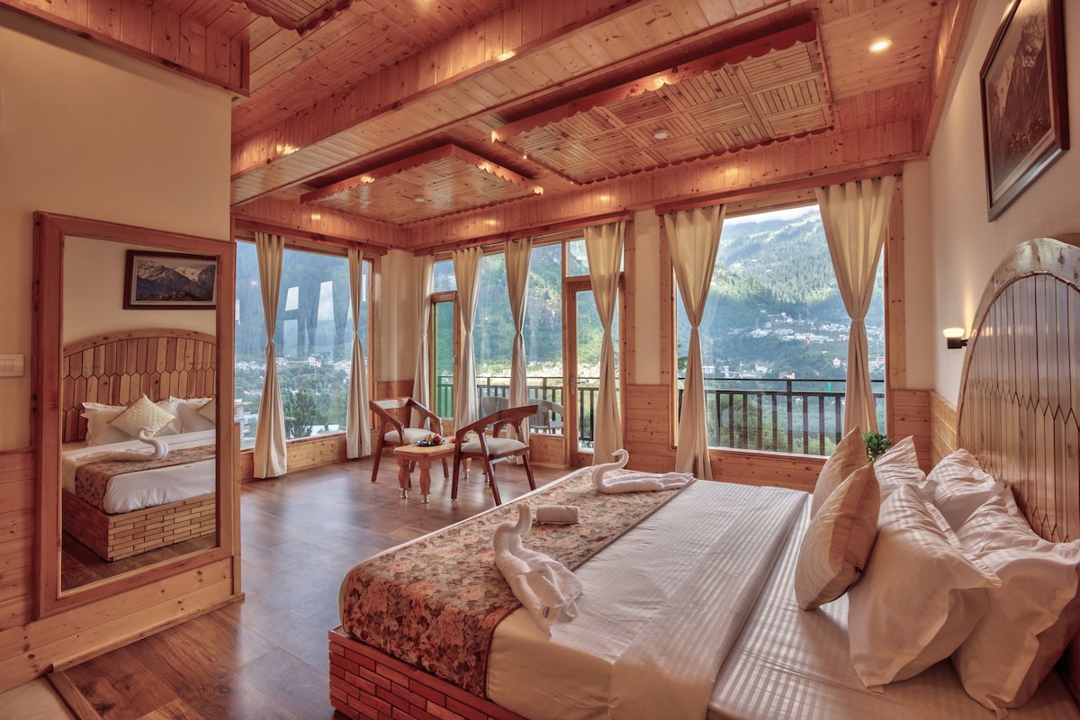 Encantadoras habitaciones de madera, a solo 4-5 pasos de un tranquilo arroyo. Disfruta de impresionantes vistas a la montaña y al río desde tu cama, complementadas con un balcón privado. Ideal para reuniones familiares o de amigos, nuestra espaciosa propiedad ofrece diversas actividades. Saborea deliciosos platos de cocina múltiple en nuestro restaurante y cafetería del hotel. Disfruta de una hospitalidad inigualable de una familia jubilada del ejército. ¡Reserva tu estadía para una escapada serena! y una escapada tranquila.