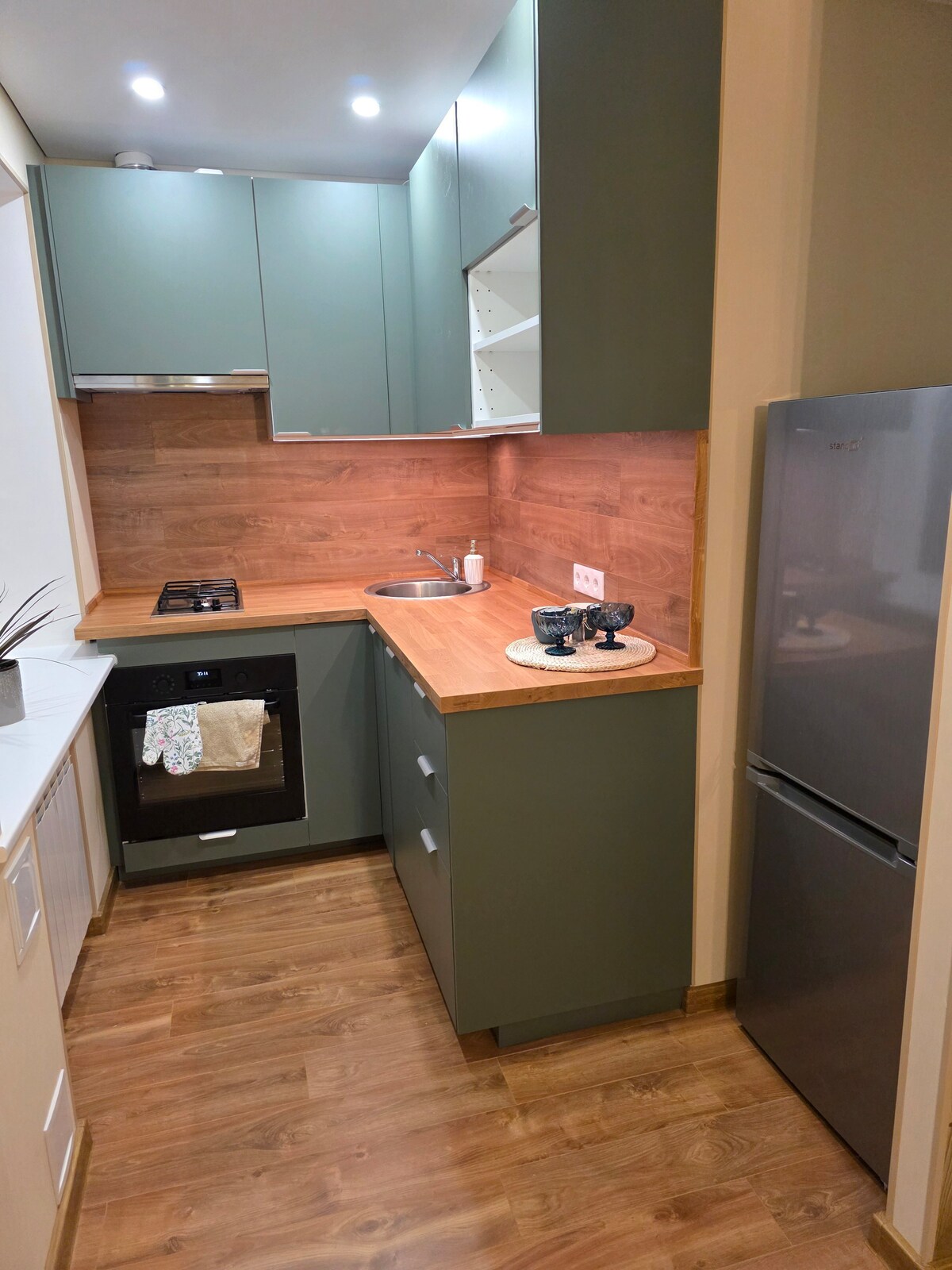 El apartamento tiene un amplio diseño con todo lo que necesitas: en la cocina, una técnica para cocinar y vajilla, una cafetera cápsula + cápsulas de café, un hervidor eléctrico y un microondas. Un sofá cama que se despliega en la sala de estar, un televisor de 55pulgadas e internet. El dormitorio es una habitación privada con armario y cortinas opacas. El apartamento está equipado con lavadora, secador de ropa, secador de pelo y aspiradora. El departamento está en una subdivisión tranquila, a poca distancia a pie del centro comercial, cine, tiendas de comestibles. Aparcamiento gratuito y vigilancia con cámara frente a la casa Estación de autobuses a 1,5 km
