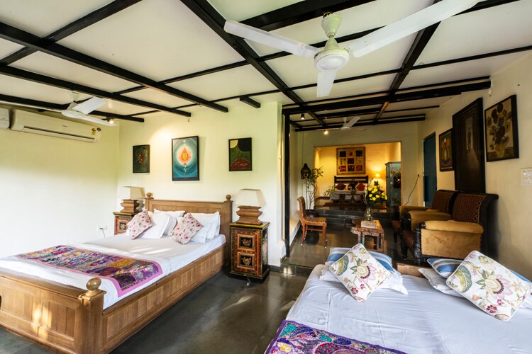Una finca agrícola de 20 acres con cinco habitaciones boutique cada una nombrada en honor a un árbol en flor cultivado en la granja. Hay una piscina de entrenamiento, césped ajardinado, lago privado, guardería de plantas, cuartos de personal, Artist Village a unas 1,5 horas en coche de Bombay y Pune. Junto a los estudios. Desayuno de cortesía. La tarifa incluye un 12% de GST.