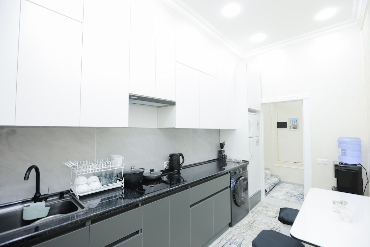 Apartamento céntrico, totalmente amueblado y completamente nuevo a poca distancia (15 min/1,4 km) del casco antiguo de Bujará. Disfruta de un alojamiento entero para cocinar, lavar la ropa y descansar entre viajes. Disfruta de este apartamento espacioso y moderno. 1 dormitorio, 1 baño con lavadora. Amplio salón con sofá cama convertible para 2 personas adicionales, cocina con nevera, horno y otros electrodomésticos básicos.