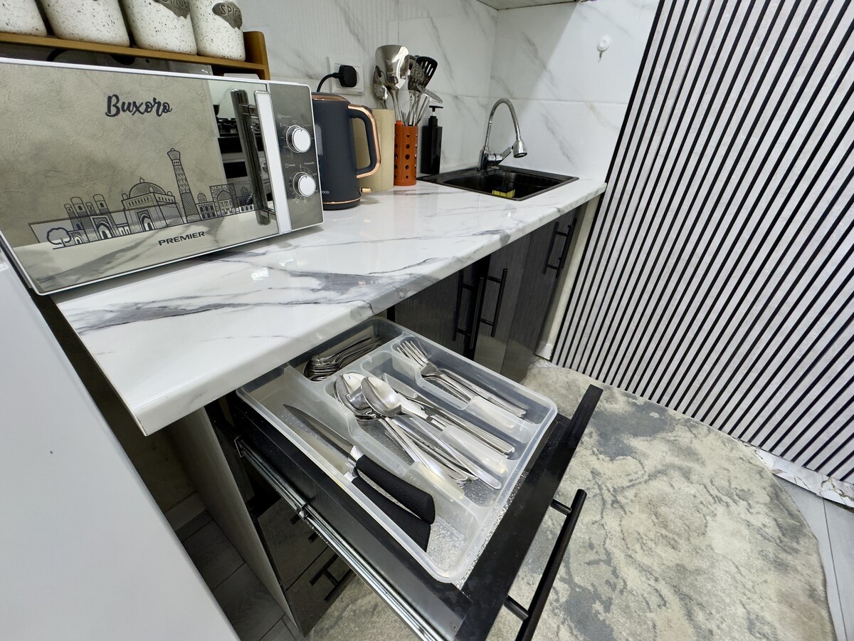 Bukhara histórico a la vuelta de la esquina: nuevo apartamento de lujo ¡Sumérgete en el corazón de la histórica Bukhara! Este nuevo y lujoso apartamento de 2 dormitorios está a solo 10 minutos a pie del encantador casco antiguo, que ofrece fácil acceso a lugares de interés antiguos y mercados vibrantes. Relájate en la espaciosa sala de estar, prepara comidas en la cocina bien equipada y disfruta de la comodidad de estar a pocos pasos del CENTRO COMERCIAL MEGA BUKHARA y MEDIPARK BUKHARA. Perfecto para explorar la rica historia y las comodidades modernas de Bukhara