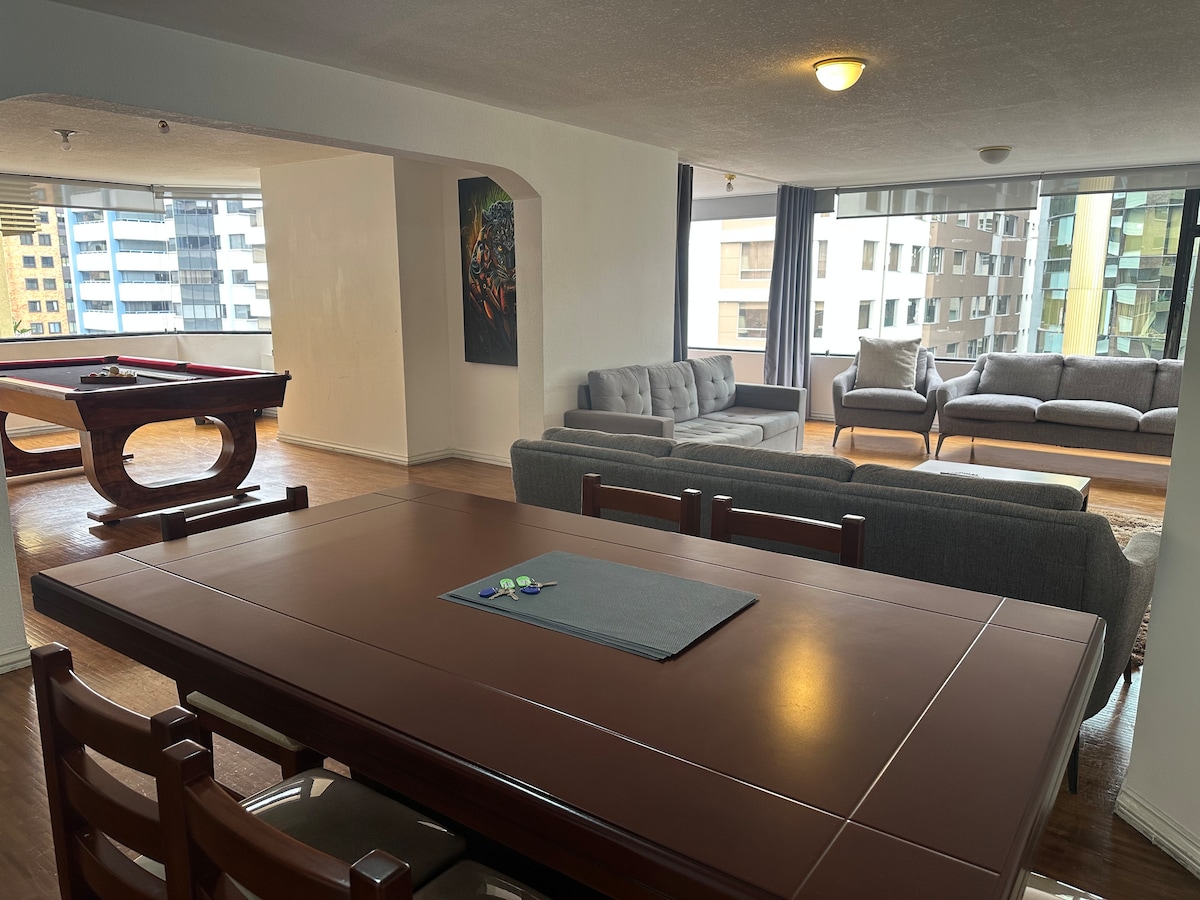 Spacious apartment with incredible panoramic views, located in one of the most exclusive residential areas of Quito. It has 3 bedrooms, 3 living rooms, 2 dining rooms, 2.5 bathrooms, terrace, balcony, 2 private parking spaces. The neighborhood is one of the safest and you can enjoy walks since it is surrounded by parks and a few minutes walk or by car from the best shopping centers, cafes and restaurants.
