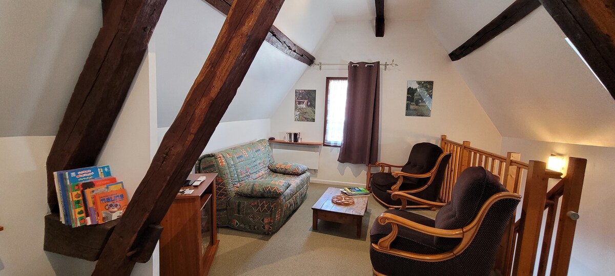 Pequeña casa unifamiliar de 2 habitaciones en un pueblo tranquilo con panadería - tienda de comestibles. Este alojamiento consta de un dormitorio (1 cama de 2 plazas de 140 y 1 cama de 70), un baño con ducha y un aseo separado arriba, una sala de estar con cocina equipada y amueblada en la planta baja con sofá cama y aseo independiente. TV, horno, microondas, nevera, cafetera + Nespresso, tostadora, hervidor de agua, toallas, paños de cocina, sábanas y edredones incluidos. Aparcamiento con 1 plaza y jardín PAT & SYL