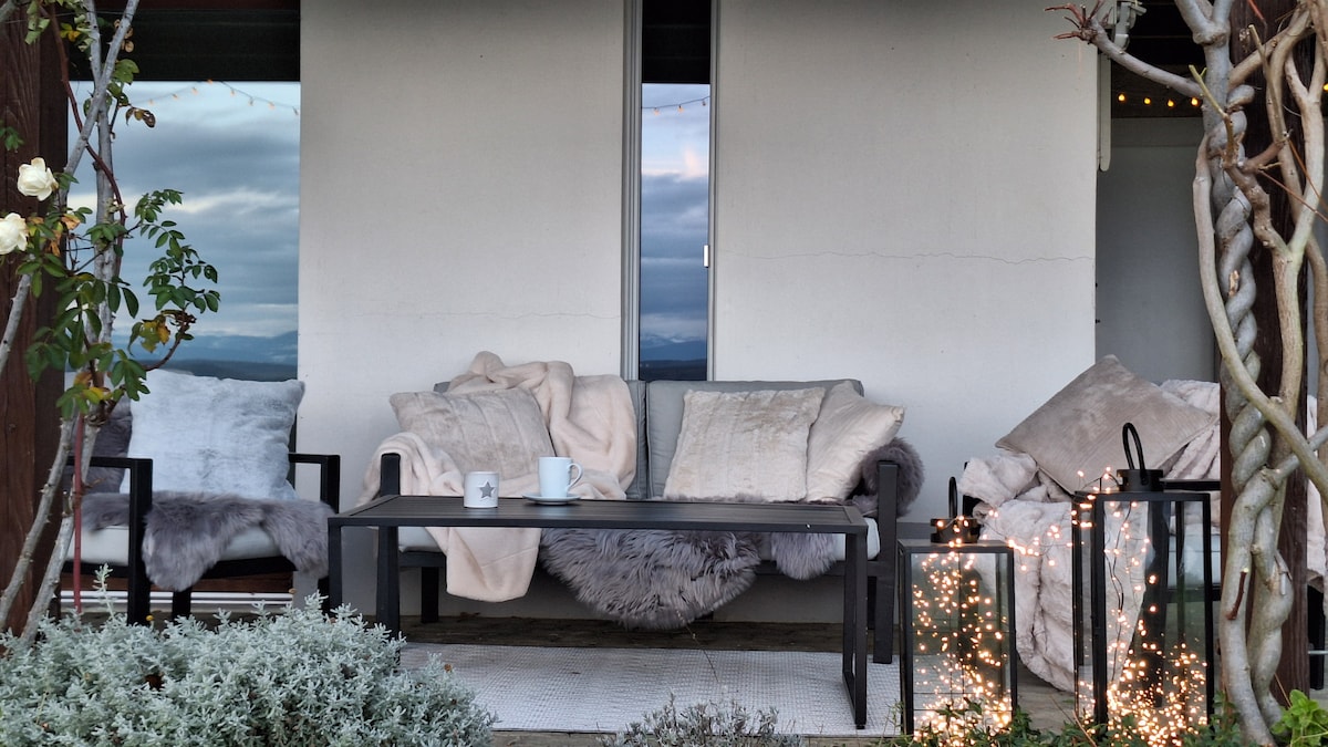 Studio Vineis: encantador alojamiento en la planta baja de nuestra casa enclavado en las alturas de Vallamand, en el corazón de los viñedos con una terraza que ofrece espléndidas vistas del lago Morat, los Alpes y el amanecer.