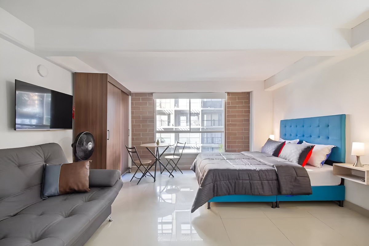 Book a stylish experience at this exclusive open plan studio near parque Lleras! - INCLUDED WITH THIS SPACE - - Dedicated work space with high speed WiFi - Private jacuzzi - Air Conditioning - Free on-site parking - 54" rotating smart TV - Netflix - King-sized hotel quality bed - Free on-site washer/dryer - Fully functional kitchen - Tea/coffee station - Black-out curtains - Body soap, shampoo & conditioner - Gym - Sauna - Swimming pool - On-site bars, restaurants & cafeteria - Art gallery