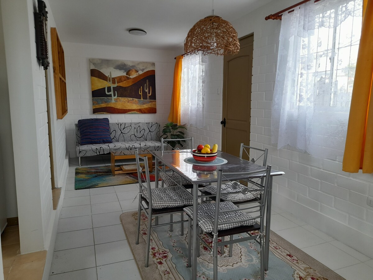 Casa completa para 2 o 3 personas dentro condominio con cierre perimetral. Ideal para parejas que buscan un lugar seguro y acogedor. 2 Habitaciones, 1 con cama matrimonial y 1 con cama individual. Baño completo con tina y ducha, cocina americana con hervidor, frigobar, vajilla y utensilios básicos. Sala de estar con comedor, 2 sofás y wi-fi. Vista al mar desde el 2 piso. Estacionamiento interior techado. 3 Huéspedes como máximo incluyendo niños mayores de 2 años No se aceptan mascotas