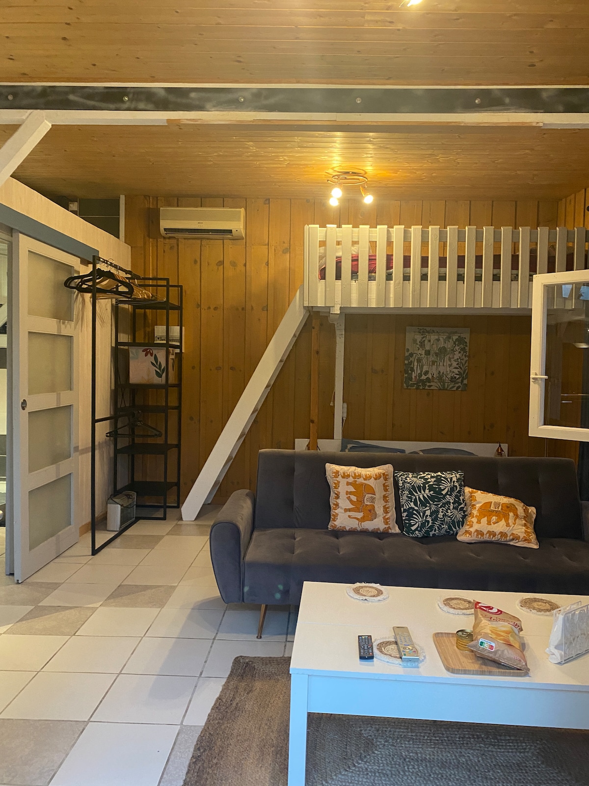 El estudio se encuentra en una zona cercana a pie, tiendas de conveniencia, el centro comercial, el transporte público y los puertos de ostras. Las playas oceánicas y la duna de Pilat están a pocos kilómetros en coche. El estudio tiene un pequeño exterior sin vecinos. No es grande, 15 m2 en la planta baja y 7 m2 en el altillo bajo el techo (1,30 m en el punto más alto). Equipado con un sofá cama de 140 con un colchón de verdad, una cama de 140 en el altillo, 2 bicicletas de montaña.