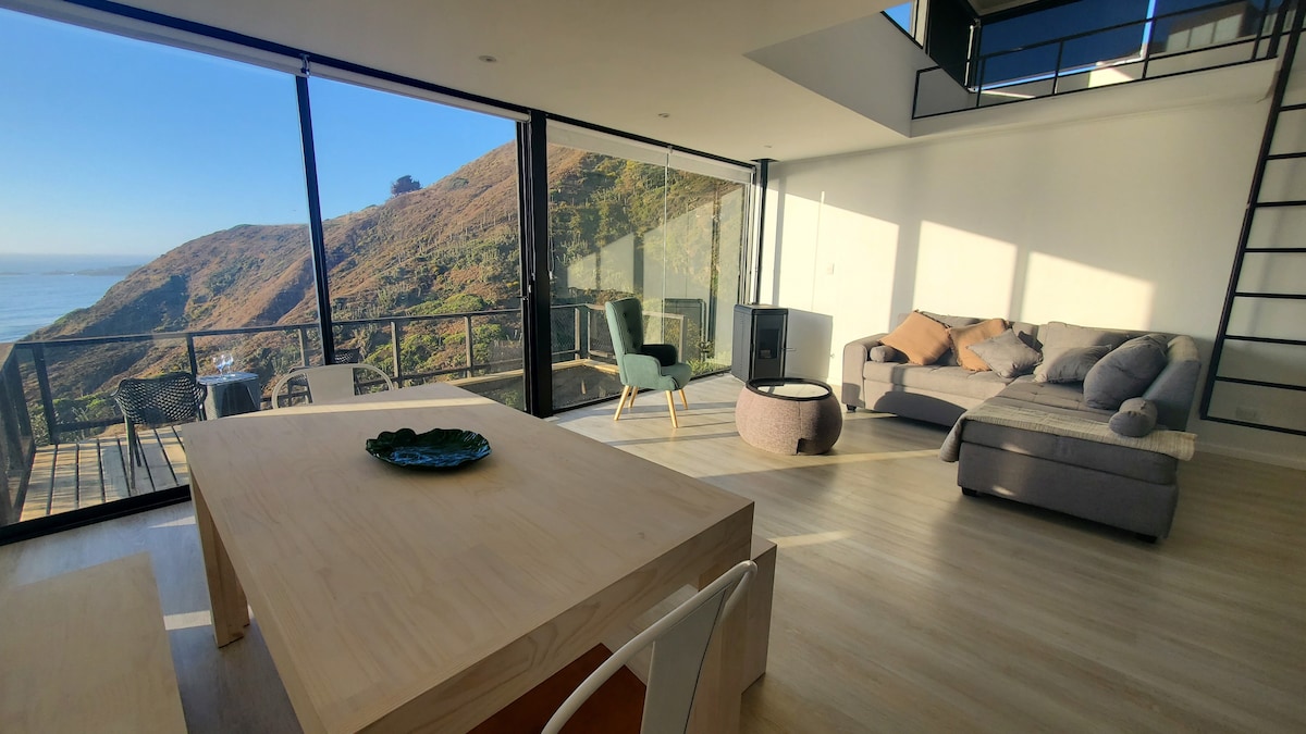 Acogedor refugio en doble altura(47mt2), de diseño único. Ideal para escapar del viento costero característico de la zona y disfrutar de templados valles, quebradas y naturaleza virgen. A pasos de la playa, restaurantes y supermercados. Servicio de HOT TUB $38.500 por estadías de 2 noches. Distancias: - A 2min de supermercado. - A 2,5km de La Vega de pupuya. - A 4km de Matanzas. - A 24km de Puertecillo. (40min) - A metros de Arena Pupuya Padel. En días de LLUVIA uso de 4x4 es requerido.