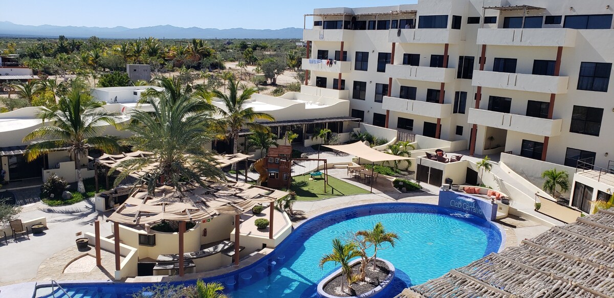 Ático con vistas despejadas a la Bahía de La Ventana y las montañas al oeste. Cocina pequeña con todos los electrodomésticos necesarios, TV inteligente e Internet rápido y confiable. Deck para amaneceres increíbles. Las comodidades del club incluyen área de descanso, parrillas de gas exclusivas para barbacoa y fogones. La alberca y el jacuzzi se sometieron a reparaciones importantes, se completaron en abril de 2024 y están nuevamente en servicio en perfectas condiciones.