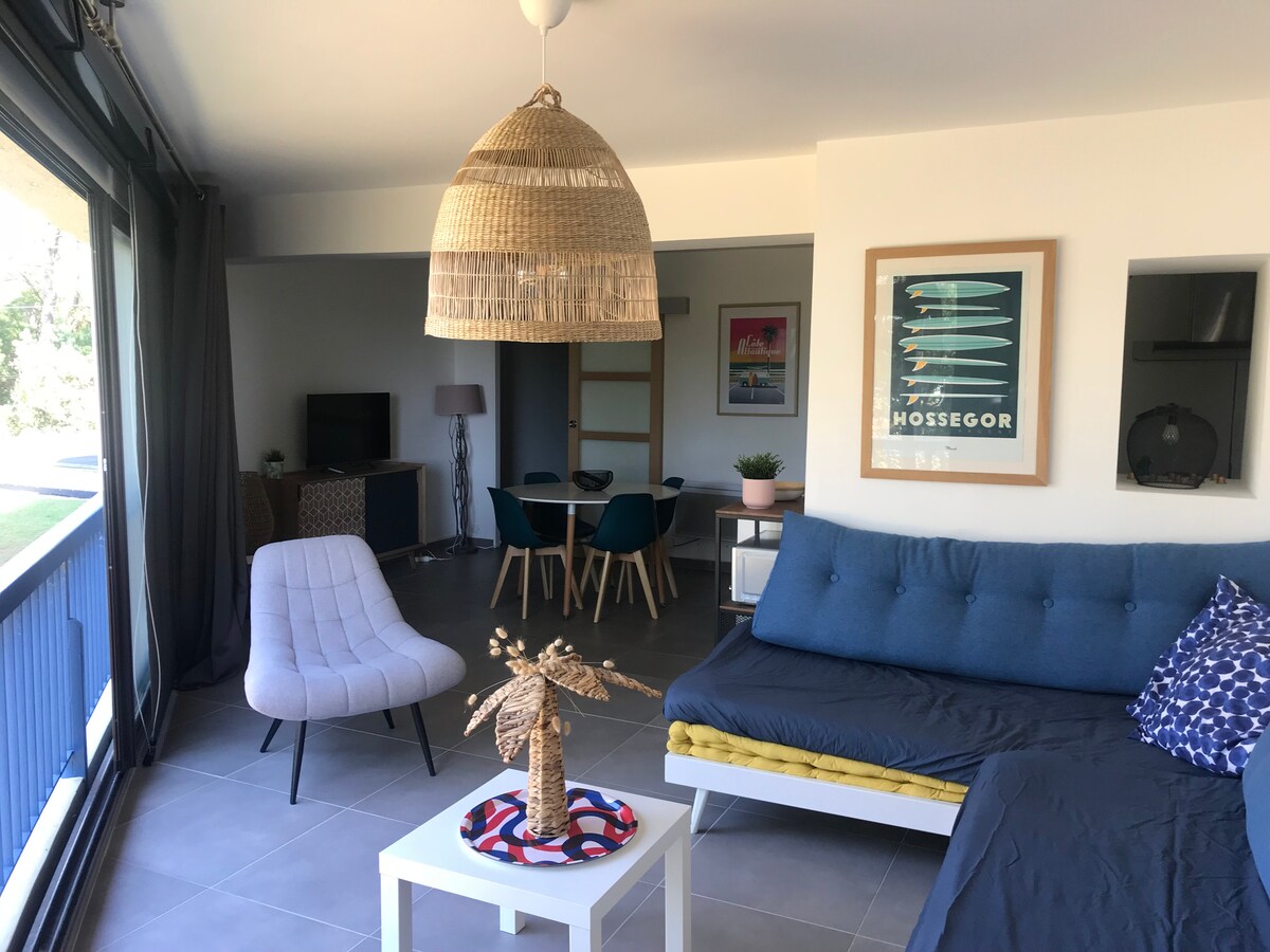 Moliets... La costa de plata, el susurro del viento en los pinos, el aroma del océano cuyas olas brillan bajo el sol. Situado a 44 km de Biarritz , a 125 km de Burdeos y a un clic de reserva de su casa . Para 2, 3, 4, 5 o 6 personas. Ven a relajarte en este apartamento situado entre la tierra y el mar, en lo alto de los pinos del campo de golf. Aquí dormirás en camas REALMENTE cómodas. Hay muchas actividades disponibles para que el álbum de fotos de sus vacaciones sea inolvidable.