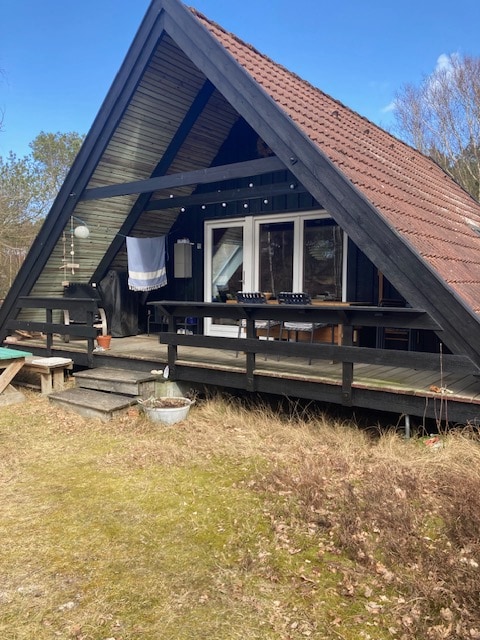 Flot svensk træhus, på en stor grund. Der er fint udekøkken med grill og vask. Der er solopvarmet udebruser. Til huset er der cykler. 1 tandem, 2 MTB 1 herrecykler og 2 damecykel + cykeltrailer. Trækvogn til små børn. Der er soveværelse med dobbeltseng, et værelse med 3/4 seng, og et værelse med køjeseng, hvor den ene seng er lille dobbeltseng . Der er også en stor hems. Shelter i haven til sove ude. Der betales 3 kr pr KW i el. Gæster sørger selv for rengøring, inden huset forlades.