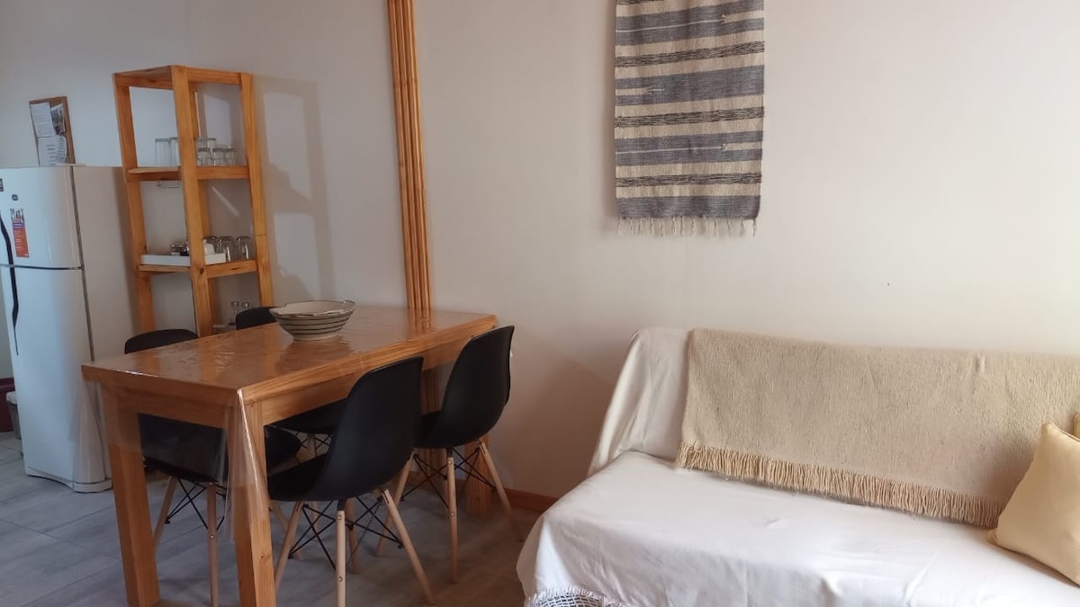 Monoambiente muy lindo, en barrio tranquilo, a pocos minutos del centro. Y a dos cuadras del Rio Quenquemtreu. Cuenta con una cama matrimonial, una cama simple tradicional. La cocina esta equipada con horno a gas, heladera, hollas y sartenes; platos vasos y cubiertos. El baño cuenta con una pequeña ventana de abrir y un cómodo espacio de ducha con muy buena presión de agua y buena temperatura. Con el servicio de alquiler, se darán jabones, toallas, toallones y sabanas.