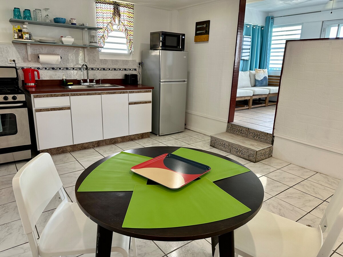 Apartamento de un dormitorio, recientemente remodelado con cama tamaño queen, una cama de matrimonio, aire acondicionado, cocina completa, sofá y una terraza con una bonita vista panorámica a la bahía de Las Croabas, Isla Palomino. Vieques y Culebra. A solo 5 minutos de la hermosa playa de Seven Seas y a poca distancia de la famosa laguna fluorescente, restaurantes y el muelle de recogida de taxis acuáticos.