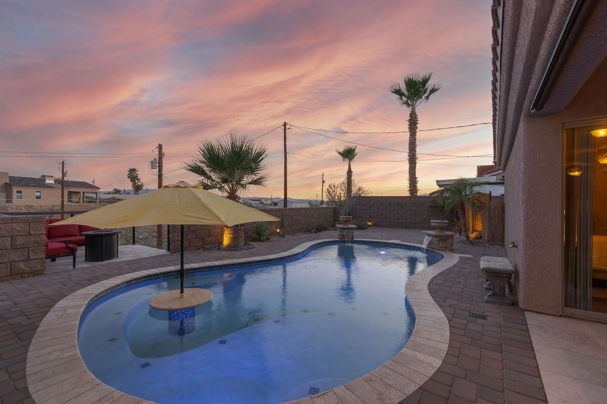 Tu escapada a Lake Havasu para familias y grupos. ☺ ★ Piscina privada (climatizada y refrigerada, coste adicional), parrilla para barbacoa y patio comedor al aire libre. 3 dormitorios • 2 baños de un solo nivel cerca del lago, restaurantes y rampas para barcos. Perfecto para vacaciones familiares, viajes en grupo o fines de semana largos bajo el sol de Arizona. + Aire acondicionado y calefacción centrales +Piscina climatizada + Parrilla para barbacoa y asientos al aire libre + Cocina pequeña con lavavajillas +Lavadora + secadora + Aparcamiento en la entrada (se admiten remolques) Se requiere aviso previo para calentar la piscina
