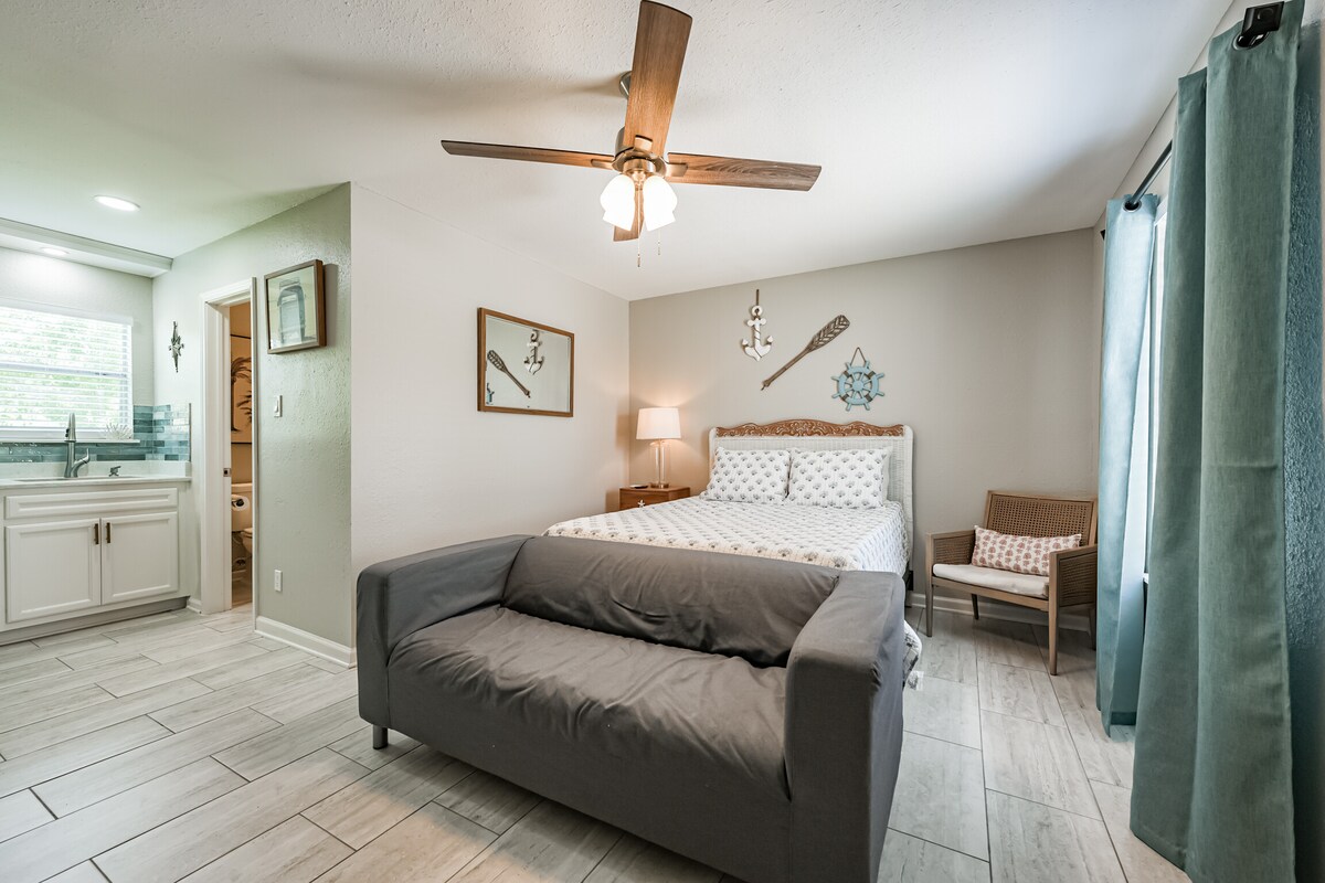 A pocos pasos de la playa sin carretera que cruzar. A unos 6 kilómetros al oeste de las atracciones del malecón, en una tranquila comunidad de playa. Perfecto para parejas o familias pequeñas. Cama tamaño queen y sofá cama tamaño queen. Wifi Xfinity rápido y TV Roku de 55 pulgadas. Se proporcionan jabón, champú, toallas, utensilios de cocina, utensilios, licuadoras y café. En la planta baja hay lavandería con lavadora y secadora, también parrilla, sombrillas, toldo, sillas, bicicletas, varios juguetes y un carrito de playa. Hay muchas opciones de comida cercanas. ¡Descuentos para toda la semana o el mes!