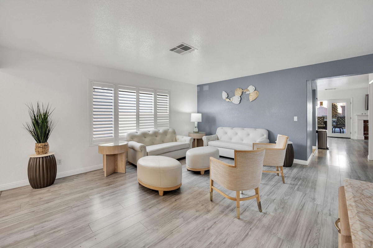 Bienvenido a tu propio oasis de estilo resort. Entra en la comodidad de Blissful Pool House. ¡Nuestra encantadora casa viene equipada para la noche de juegos y entretenimiento a solo 7,4 millas de la famosa franja de Las Vegas! Disfrute de toda esta espaciosa casa que también es apta para niños. Tiendas de comestibles, mercados, bares cercanos. Hay 5 plazas de aparcamiento gratuitas disponibles para nuestros huéspedes frente a la propiedad, y el aparcamiento para autocaravanas está incluido.