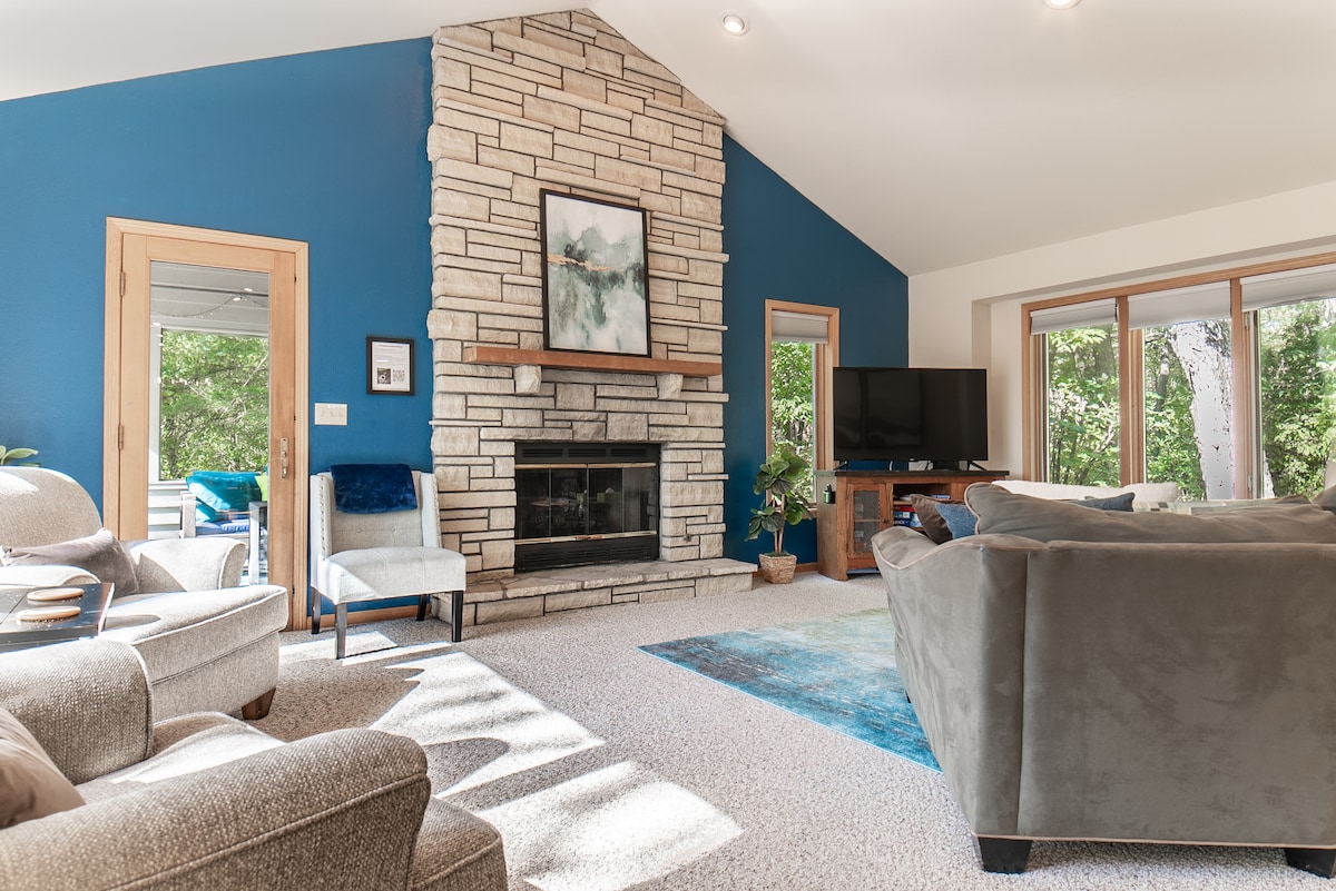 ¿Buscas naturaleza? Ven a sumergirte en la naturaleza en este oasis privado. • 3 camas/3,5 baños (7 adultos cómodamente con un máximo de 8 huéspedes) • A 12 minutos del centro de Galena. • Jacuzzi al aire libre • Parrilla y comedor en la terraza superior • Vistas de temporada del lago Galena • Sala de estar/sala de cine con mesa de billar, chimenea eléctrica y TV inteligente • Cocina completa con nevera, horno, microondas, lavavajillas, cafetera keurig, freidora de aire, olla instantánea y olla • Sala familiar en la planta superior con televisor inteligente, chimenea y juegos de mesa