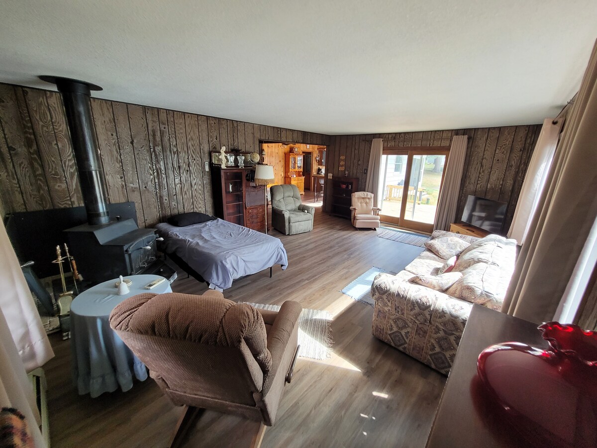 Disfruta de nuestra pequeña casa ecológica hecha a medida encaramada en la cima de la cresta sobre el majestuoso valle del río St Croix. Disfruta de amplias vistas desde la terraza, el loft o las numerosas ventanas que dan al valle. Disfruta de nuestra sauna privada en forma de barril, fogata, parrilla de gas, estanque con canoas y kayak o Wolf Creek con un pozo de agua cristalina privado. O simplemente relájate en la cresta observando las aves y la vida silvestre. ¡A poco más de una hora en auto de las ciudades gemelas, te espera una estancia romántica e inolvidable!
