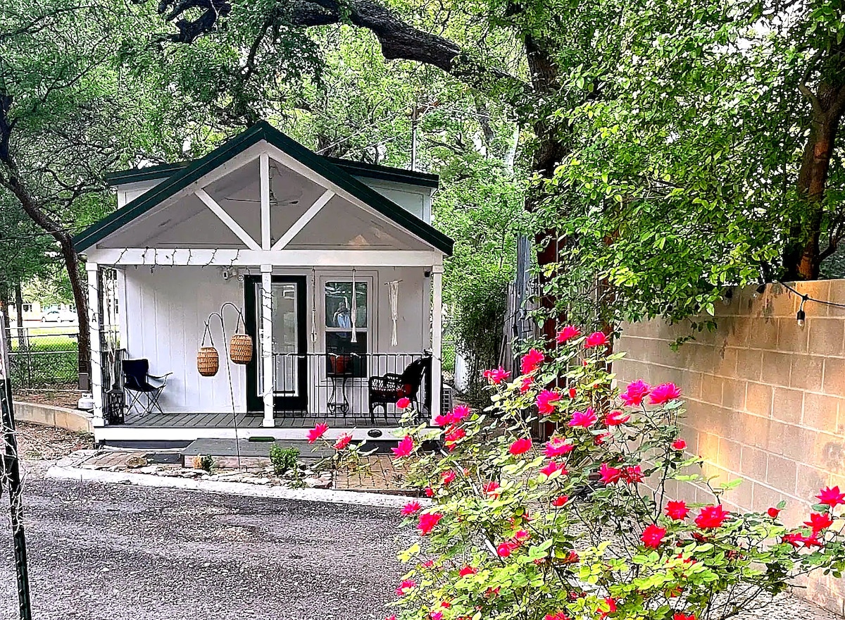 La cabaña FoxHollow ofrece un refugio tranquilo bajo los robles de Texas en nuestra finca familiar llamada Deerhaven. ¡Una escapada única en la naturaleza similar a un campamento! Una espaciosa cama tamaño king, wifi, aire acondicionado, calefacción, RokuTV, microondas, mininevera, Keurig, terraza y una zona privada de barbacoa/picnic. Los ciervos te saludan a lo largo del camino hacia tu propio baño completo reservado, uno de los 3 baños privados ubicados en nuestras instalaciones separadas a pocos pasos de tu cabaña. Disfruta del aire fresco, la vida silvestre y el ambiente de Hill Country, a solo 8 minutos de tiendas y restaurantes.