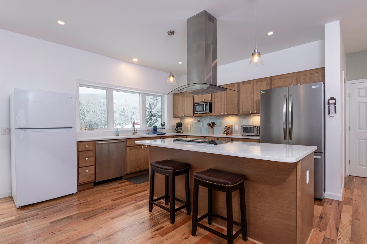 - Nueva construcción con estructura en A situada en el centro para esquiar, hacer senderismo, golf, ciclismo de montaña o simplemente relajarse junto al lago (compartimos un acre junto al lago con otras 4 casas). - Ideal para familias o parejas con 4 dormitorios y 3 baños (más un loft) distribuidos en 3 plantas. - Cocina totalmente equipada, estufa de leña, fogatas (tenemos 3) y muy bien apartada de la carretera para mayor privacidad. - Sótano equipado con piscina, dardos, ping pong, juegos y libros, backgammon, etc. - Disponibles canoa, SUP y chalecos salvavidas.