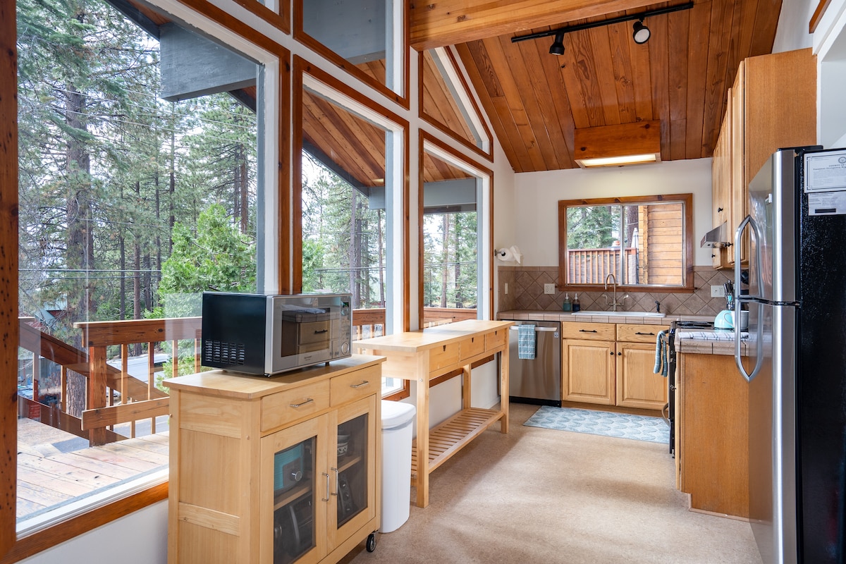 ¡Vive como un habitante más, en este espacio recientemente actualizado! A dos cuadras de la ciudad de Tahoe. Senderos de esquí de fondo y raquetas de nieve justo en la puerta trasera, a 15 minutos de la estación de esquí Alpine Meadows. ¡Camina hasta la ciudad y Après en los mejores restaurantes de Tahoe! Esta cabaña es de 368 pies cuadrados. Tiene una chimenea de gas en un termostato que lo mantiene agradable y cálido en los meses de invierno. Se incluye la retirada de nieve. ¡Hay una nueva gama de gas/horno y todos los utensilios de cocina que necesites! ¡También contamos con un refrigerador nuevo!