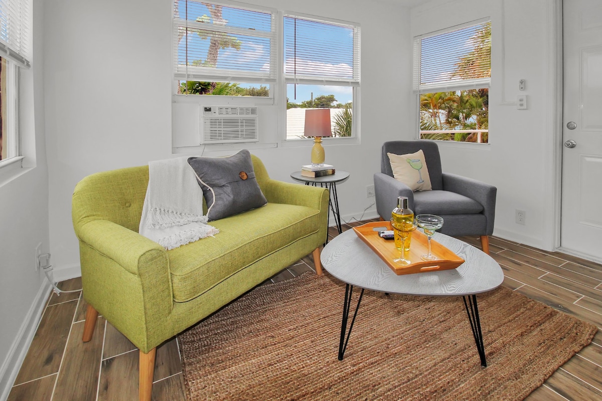 Precioso y moderno apartamento de 1 dormitorio y 1 baño situado a poca distancia a pie de la playa de Lantana. A pocos pasos de Intracoastal Waterway y a solo 1 milla de la playa. Instalaciones con vistas al mar. A poca distancia a pie del centro de la ciudad y de famosos restaurantes, cafeterías y tiendas locales. Actividades: paseos en bote, pesca, buceo, esnórquel y playa. Parques de playa y una rampa para barcos cerca. - Cama tamaño king, armario enorme, espejo de cuerpo completo. - Sala de estar moderna con otomana y vistas al jardín. - TV de 55 pulgadas, Internet de alta velocidad. - Cocina equipada. Aparcamiento.