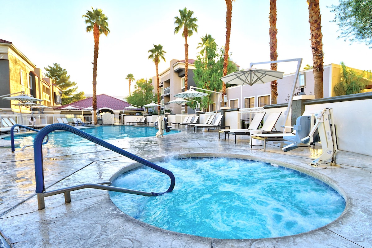 Esta suite de 1 dormitorio de 835 pies cuadrados está totalmente equipada y es perfecta para personas o grupos pequeños que quieran vivir la experiencia de Las Vegas mientras disfrutan de las comodidades de un hogar. Este lujoso estudio es a la vez amplio y acogedor, con una vista increíble. Este estudio tiene capacidad para un máximo de 4 personas con una cama tamaño king y un sofá cama extraíble de tamaño completo. • SIN TASA DEL CENTRO VACACIONAL • Wifi gratuito. • Acceso a la piscina y al gimnasio. • A poca distancia a pie del Strip de Las Vegas y TopGolf. • Aparcamiento gratuito.