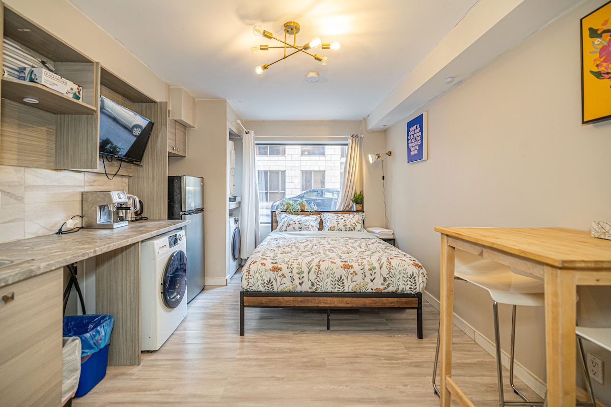 Estudio con cama doble, cocina pequeña, baño privado y entrada privada al apartamento. Muy buen vecindario, a 10 minutos a pie de la estación de metro Jolicoeur, que está a 8 estaciones del centro de la ciudad (15 minutos). Muy amable y hospitalario. Medio sótano. La escalera no es muy grande (un poco más pequeña que las escaleras normales). El techo es más bajo de lo normal, 6 pies y 7 pulgadas (2 metros). ¡No apto para más de 2 personas! Perfecto para estadías cortas.