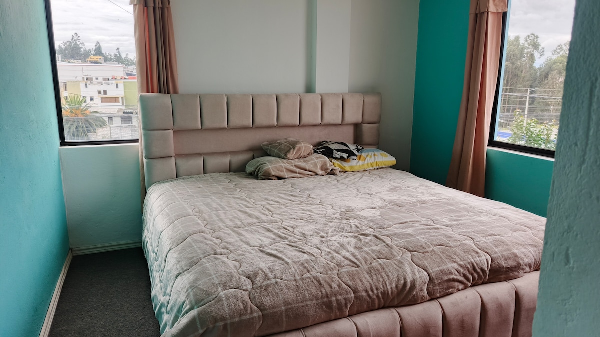 Disfruta de un alojamiento moderno, acogedor y céntrico en Latacunga. Este espacio cuenta con una cocina equipada, baño privado, Wi-Fi, TV, sala, comedor y una cómoda habitación ideal para el descanso. A pocos pasos del centro histórico con entrada independiente. Perfecto para quienes buscan confort, privacidad y buena ubicación, cuenta con parqueadero para vehículos pequeños, si su vehículo es grande a 20 pasos existe un parqueadero público muy seguro.