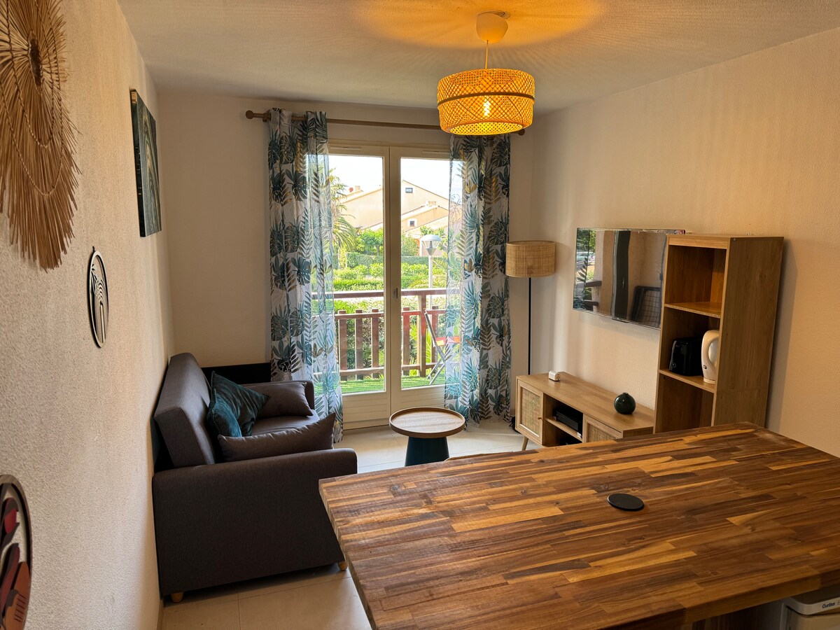 Esta tranquila y elegante T2 de 42 m2 te da la bienvenida en un ambiente vintage de los años 50. Situado a tiro de piedra del centro de la ciudad, cerca de tiendas y a pocos minutos de las playas, ofrece un entorno ideal para relajarse. Disfrutarán: - su dormitorio soleado y su cómoda cama "tamaño queen", - su cálida sala de estar con sofá cama, - su soleado jardín privado y su barbacoa. Perfecto para disfrutar del clima mediterráneo. Disfruta, Fabien