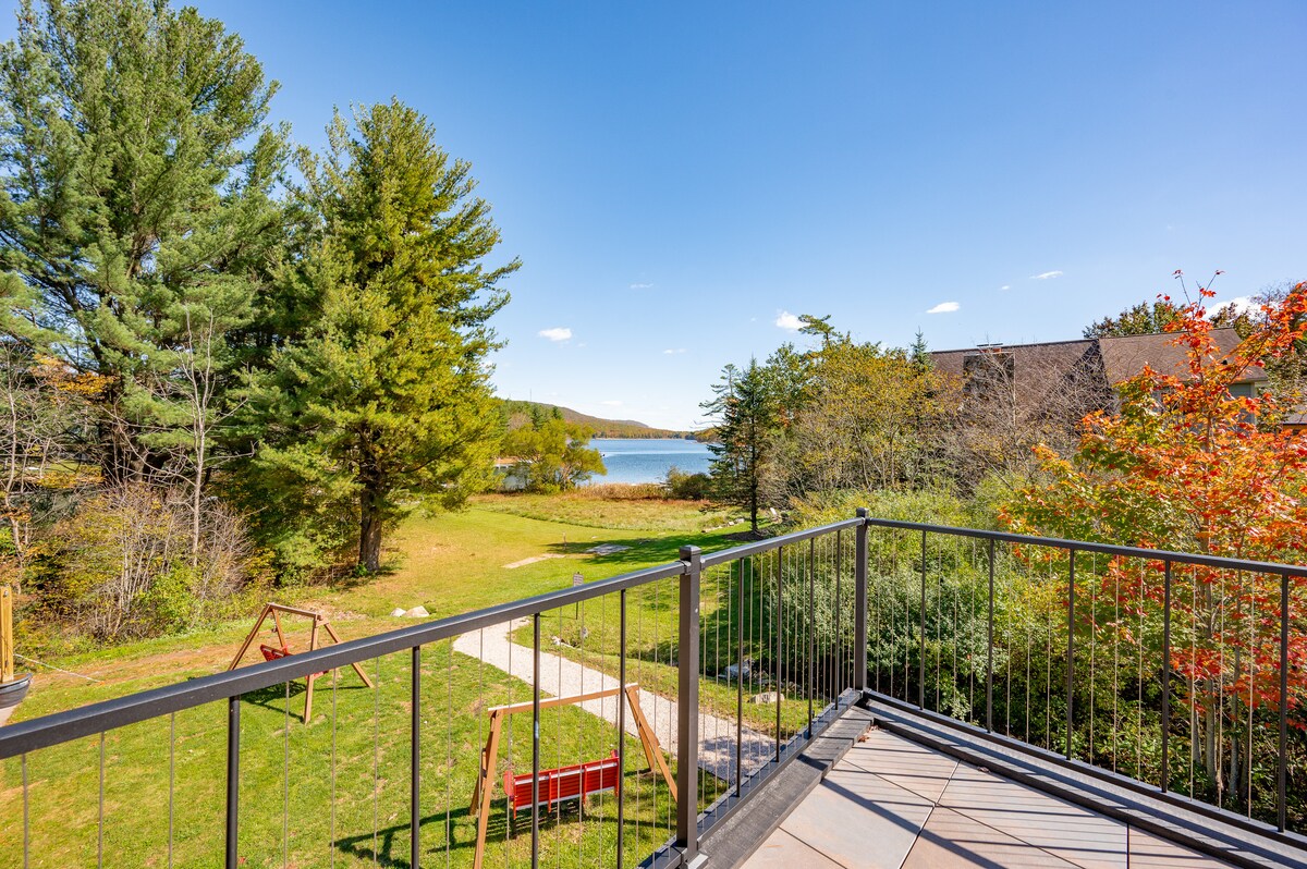 Desconecta y relájate en esta espaciosa habitación con techo abovedado de estilo cabaña de madera con dos camas tamaño queen y una chimenea eléctrica para que todos disfruten. Equipado con un lujoso baño con ducha a ras de suelo, productos de baño de calidad, cocina y Smart TV. Disfruta del aire fresco de la montaña y de tu café de la mañana caminando directamente desde tu puerta hasta la terraza, donde tienes dos sillas que inmediatamente muestran un hermoso amanecer con vistas al lago.