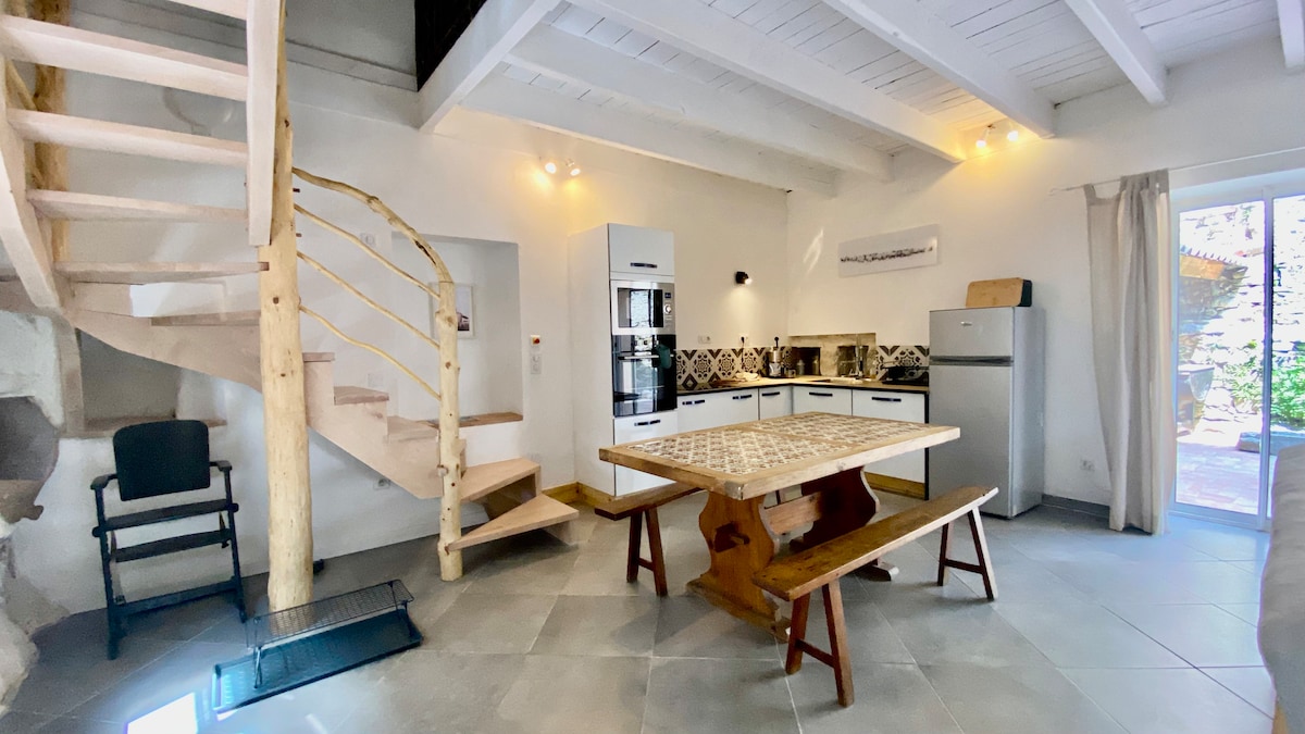 Este alojamiento único está en pleno centro de la ciudad medieval. Tiene un patio interior y sin vecinos, muy raro en la ciudad. Venga a descubrir la belleza de la meseta del Larzac y sumérjase en este pueblo fortificado clasificado; el pueblo más bonito de Francia. Los materiales son de calidad, la escalera a medida está construida con boj y un árbol procedente directamente de la meseta del Larzac.